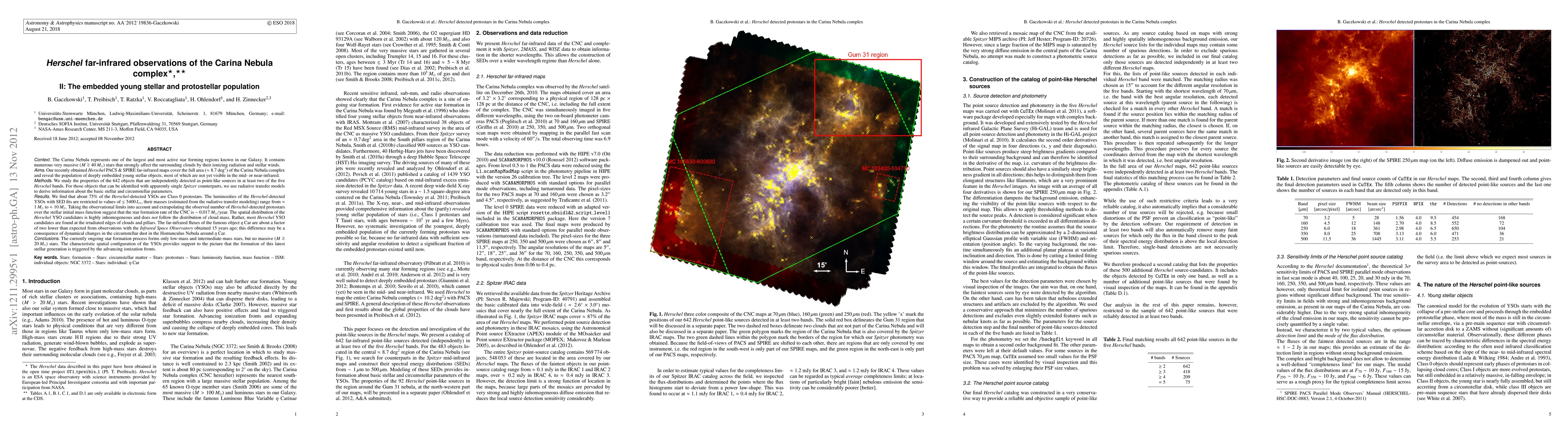 This paper uses Herschel far-infrared observations to study the embedded young stellar and protostellar population in the Carina Nebula complex, revealing 642 deeply embedded objects, mostly Class 0 protostars with masses ranging from 1 to 10 Msun. The star formation rate is estimated at 0.017 Msun/yr, with star formation triggered by ionization fronts.