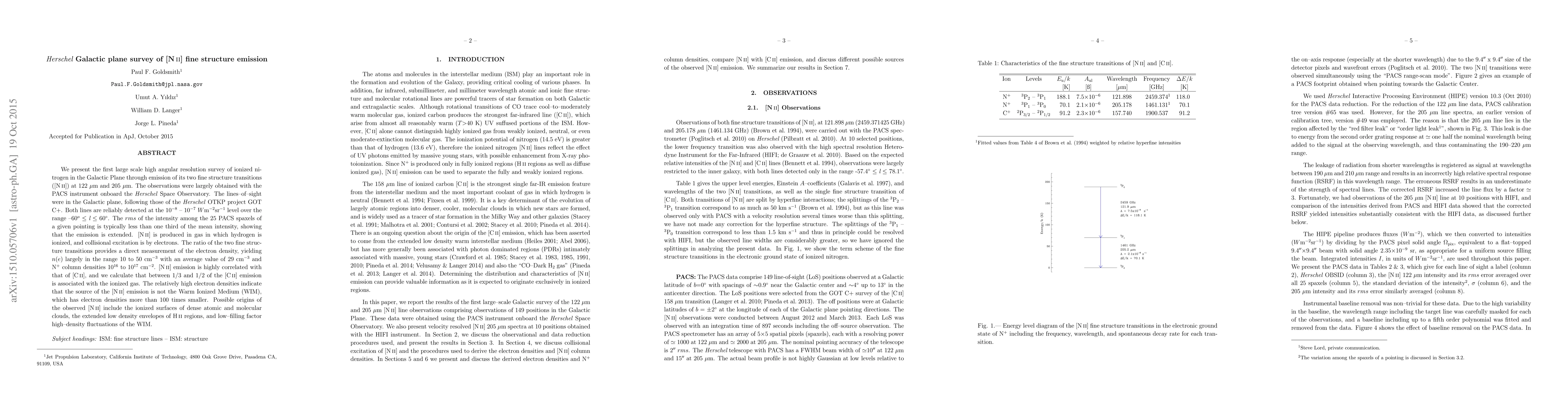 We present the first large scale high angular resolution survey of ionized nitrogen in the Galactic Plane through emission of its two fine structure transitions ([NII]) at 122 $\mu$m and 205 $\mu$m. The observations were largely obtained with the PACS instrument onboard the Herschel Space Observatory. The lines-of-sight were in the Galactic plane, following those of the Herschel OTKP project GOT C+. Both lines are reliably detected at the 10$^{-8}$ - 10$^{-7}$ $W$m$^{-2}$sr$^{-1}$ level over the range -60$^{o}$ $\leq$ $l$ $\leq$ 60$^{o}$. The $rms$ of the intensity among the 25 PACS spaxels of a given pointing is typically less than one third of the mean intensity, showing that the emission is extended. [NII] is produced in gas in which hydrogen is ionized, and collisional excitation is by electrons. The ratio of the two fine structure transitions provides a direct measurement of the electron density, yielding $n(e)$ largely in the range 10 to 50 cm$^{-3}$ with an average value of 29 cm$^{-3}$ and N$^+$ column densities 10$^{16}$ to 10$^{17}$ cm$^{-2}$. [NII] emission is highly correlated with that of [CII], and we calculate that between 1/3 and 1/2 of the [CII] emission is associated with the ionized gas. The relatively high electron densities indicate that the source of the [NII] emission is not the Warm Ionized Medium (WIM), which has electron densities more than 100 times smaller. Possible origins of the observed [NII] include the ionized surfaces of dense atomic and molecular clouds, the extended low density envelopes of HII regions, and low-filling factor high-density fluctuations of the WIM.