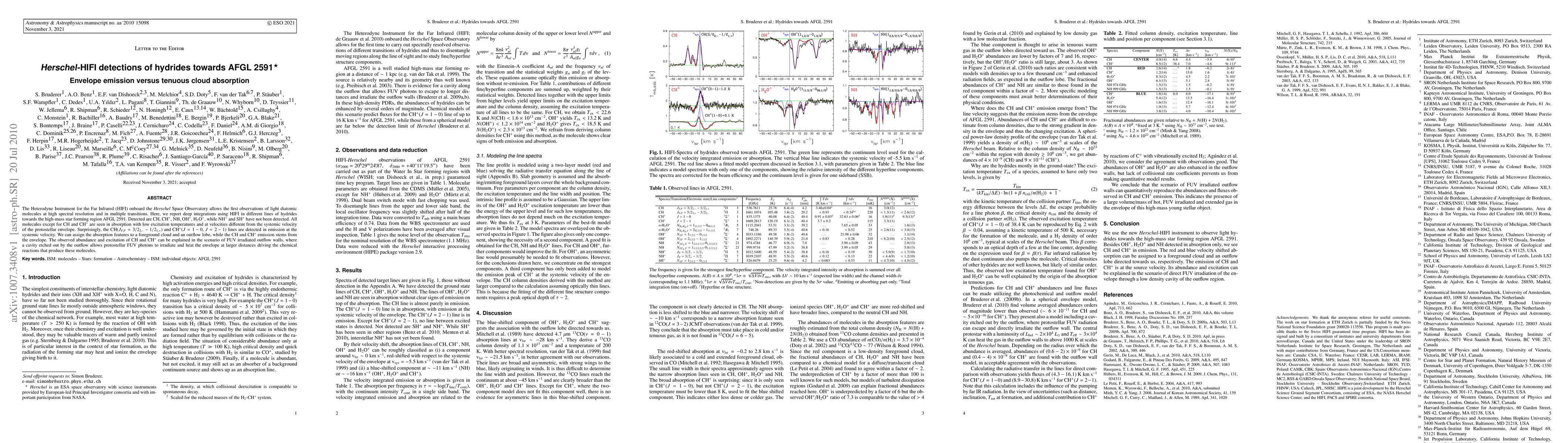 The Herschel-HIFI instrument detected various hydrides in emission and absorption towards the high-mass star-forming region AFGL 2591, with CH and CH+ in emission likely due to FUV irradiation from protostellar photons. Absorption features suggest contributions from a foreground cloud and an outflow lobe.