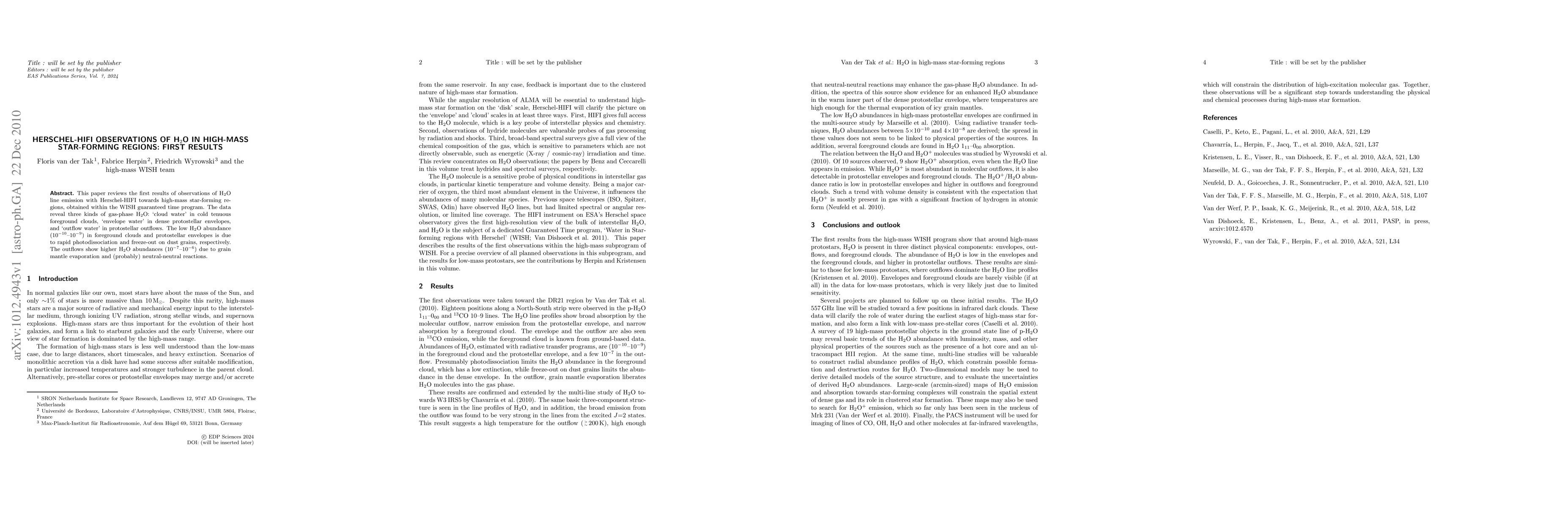 This paper reviews the first results of observations of H2O line emission with Herschel-HIFI towards high-mass star-forming regions, obtained within the WISH guaranteed time program. The data reveal three kinds of gas-phase H2O: `cloud water' in cold tenuous foreground clouds, `envelope water' in dense protostellar envelopes, and `outflow water' in protostellar outflows. The low H2O abundance (1e-10 -- 1e-9) in foreground clouds and protostellar envelopes is due to rapid photodissociation and freeze-out on dust grains, respectively. The outflows show higher H2O abundances (1e-7 -- 1e-6) due to grain mantle evaporation and (probably) neutral-neutral reactions.
