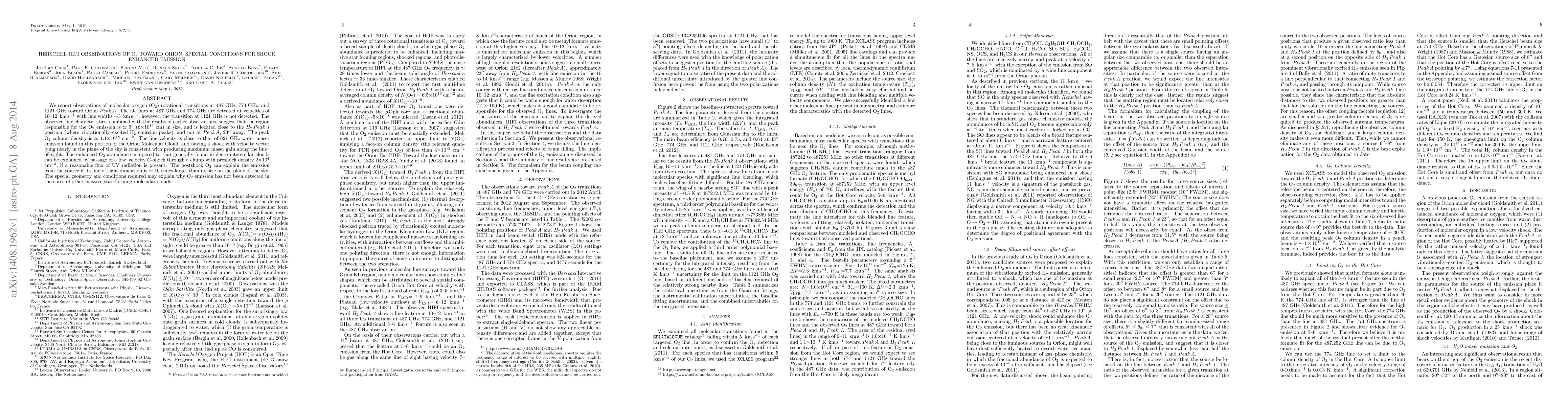 We report observations of molecular oxygen (O$_2$) rotational transitions at 487 GHz, 774 GHz, and 1121 GHz toward Orion Peak A. The O2 lines at 487 GHz and 774 GHz are detected at velocities of 10-12 km/s with line widths 3 km/s; however, the transition at 1121 GHz is not detected. The observed line characteristics, combined with the results of earlier observations, suggest that the region responsible for the O$_2$ emission is 9" (6e16 cm) in size, and is located close to the H2 Peak 1position (where vibrationally-excited H$_2$ emission peaks), and not at Peak A, 23" away. The peak O2 column density is 1.1e18/cm2. The line velocity is close to that of 621 GHz water maser emission found in this portion of the Orion Molecular Cloud, and having a shock with velocity vector lying nearly in the plane of the sky is consistent with producing maximum maser gain along the line-of-sight. The enhanced O$_2$ abundance compared to that generally found in dense interstellar clouds can be explained by passage of a low-velocity C-shock through a clump with preshock density 2e4/cm3, if a reasonable flux of UV radiation is present. The postshock O$_2$ can explain the emission from the source if its line of sight dimension is ~10 times larger than its size on the plane of the sky. The special geometry and conditions required may explain why O$_2$ emission has not been detected in the cores of other massive star-forming molecular clouds.