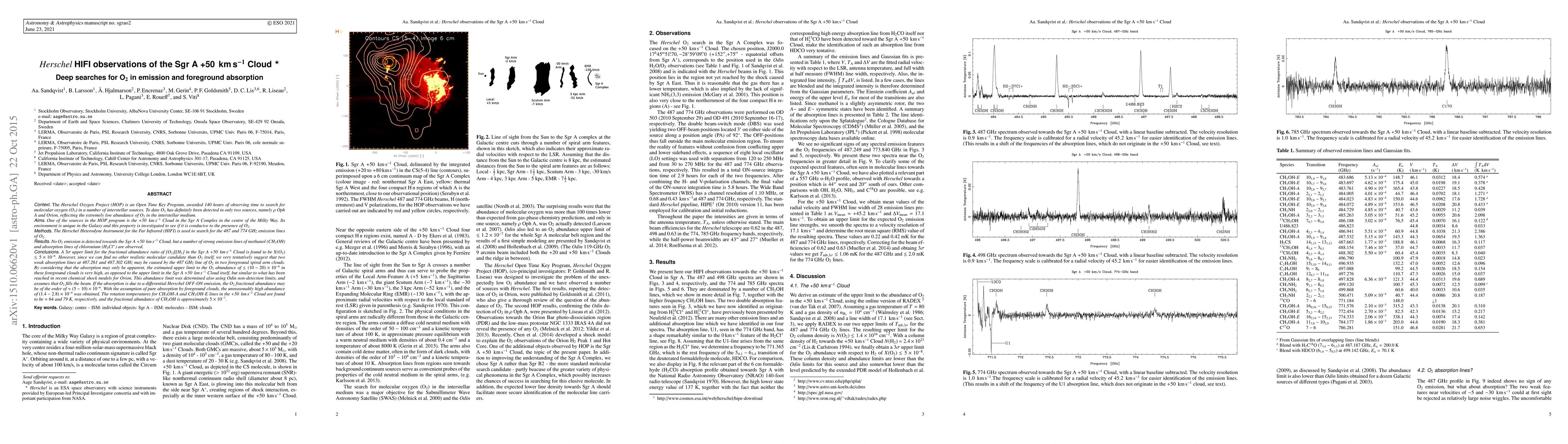 The Herschel HIFI observations of the Sgr A +50 km/s Cloud did not detect O2 emission, but found strong methanol and chloronium lines. The study suggests a tentative detection of O2 absorption in foreground clouds, estimating an upper limit abundance of O2 in the range of (5-10) x 10(-6).