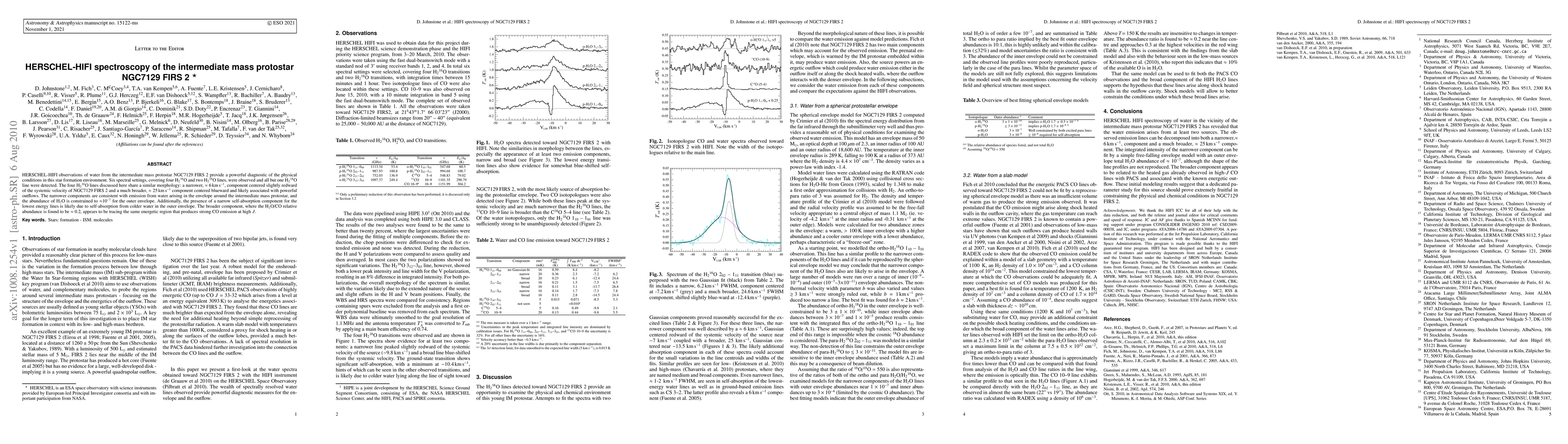 HERSCHEL-HIFI observations of water from the intermediate mass protostar NGC7129 FIRS 2 provide a powerful diagnostic of the physical conditions in this star formation environment. Six spectral settings, covering four H216O and two H218O lines, were observed and all but one H218O line were detected. The four H2 16 O lines discussed here share a similar morphology: a narrower, \approx 6 km/s, component centered slightly redward of the systemic velocity of NGC7129 FIRS 2 and a much broader, \approx 25 km/s component centered blueward and likely associated with powerful outflows. The narrower components are consistent with emission from water arising in the envelope around the intermediate mass protostar, and the abundance of H2O is constrained to \approx 10-7 for the outer envelope. Additionally, the presence of a narrow self-absorption component for the lowest energy lines is likely due to self-absorption from colder water in the outer envelope. The broader component, where the H2O/CO relative abundance is found to be \approx 0.2, appears to be tracing the same energetic region that produces strong CO emission at high J.