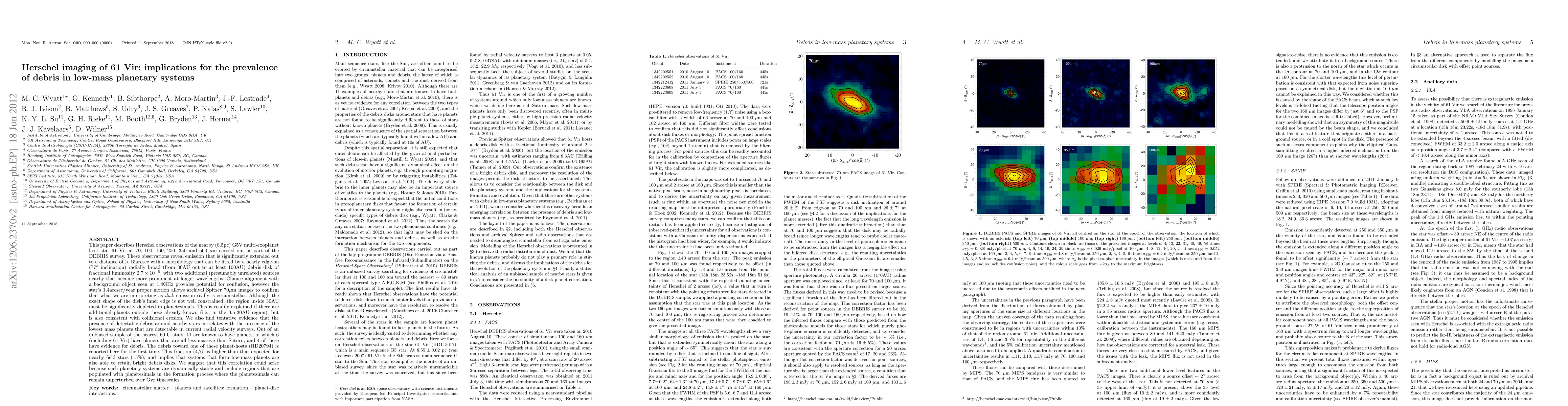 This paper describes Herschel observations of the nearby (8.5pc) G5V multi-exoplanet host star 61 Vir at 70-500micron carried out by the DEBRIS survey. These reveal emission that is extended out to >15arcsec with a morphology that can be fitted by a nearly edge-on (77deg inclination) radially broad (from 30AU to >100AU) debris disk of fractional luminosity 2.7x10^-5, with two unrelated sources nearby that are more prominent at longer wavelengths. Chance alignment with a background object seen at 1.4GHz provides potential for confusion, but the star's 1.4"/yr proper motion allows Spitzer 70micron images to confirm that what we are interpreting as disk emission really is circumstellar. Although the exact shape of the disk's inner edge is not well constrained, the region inside 30AU must be significantly depleted in planetesimals. This is readily explained if there are additional planets in the 0.5-30AU region, but is also consistent with collisional erosion. We also find tentative evidence that the presence of detectable debris around nearby stars correlates with the presence of the lowest mass planets that are detectable in current radial velocity surveys. Out of an unbiased sample of the nearest 60 G stars, 11 are known to have planets, of which 6 (including 61 Vir) have planets that are all less massive than Saturn, and 4 of these have evidence for debris. The debris toward one of these planet-hosts (HD20794) is reported here for the first time. This fraction (4/6) is higher than that expected for nearby field stars (15%), and implies that systems that form low-mass planets are also able to retain bright debris disks. We suggest that this correlation could arise because such planetary systems are dynamically stable and include regions that are populated with planetesimals in the formation process where the planetesimals can remain unperturbed over Gyr timescales.
