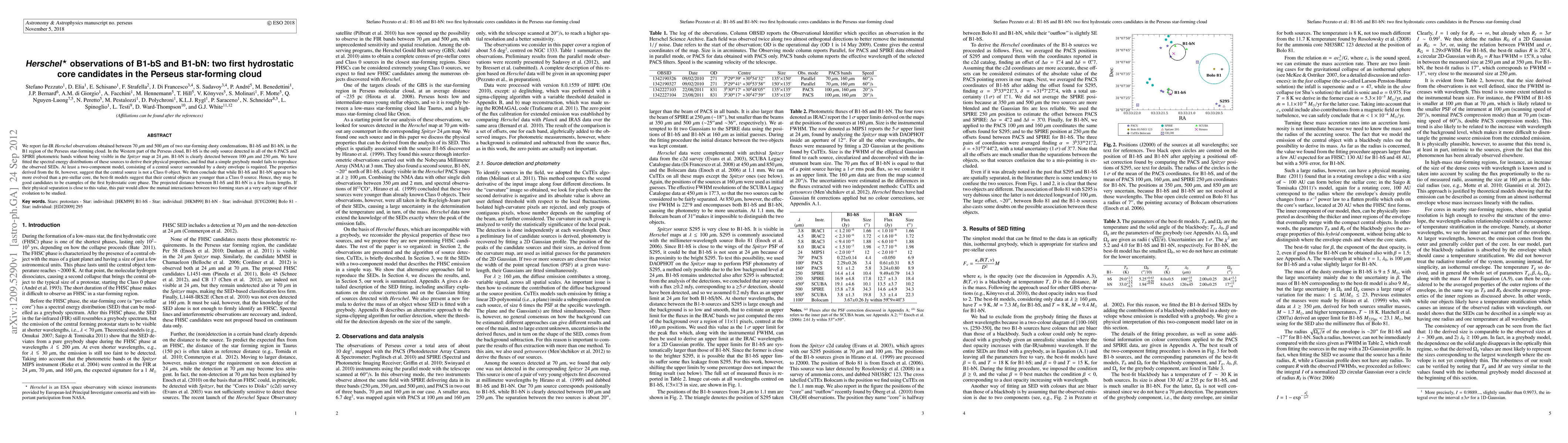 We report far-IR Herschel observations obtained between 70 $\mu$m and 500 $\mu$m of two star-forming dusty condensations, B1-bS and B1-bN, in the B1 region of the Perseus star-forming cloud. In the Western part of the Perseus cloud, B1-bS is the only source detected in all of the 6 PACS and SPIRE photometric bands without being visible in the Spitzer map at 24 $\mu$m. B1-bN is clearly detected between 100 $\mu$m and 250 $\mu$m. We have fitted the spectral energy distributions of these sources to derive their physical properties, and find that a simple greybody model fails to reproduce the observed SEDs. At least a two-component model, consisting of a central source surrounded by a dusty envelope is required. The properties derived from the fit, however, suggest that the central source is not a Class 0 object. We then conclude that while B1-bS and B1-bN appear to be more evolved than a pre-stellar core, the best-fit models suggest that their central objects are younger than a Class 0 source. Hence, they may be good candidates to be examples of the first hydrostatic core phase. The projected distance between B1-bS and B1-bN is a few Jeans lengths. If their physical separation is close to this value, this pair would allow the mutual interactions between two forming stars at a very early stage of their evolution to be studied.