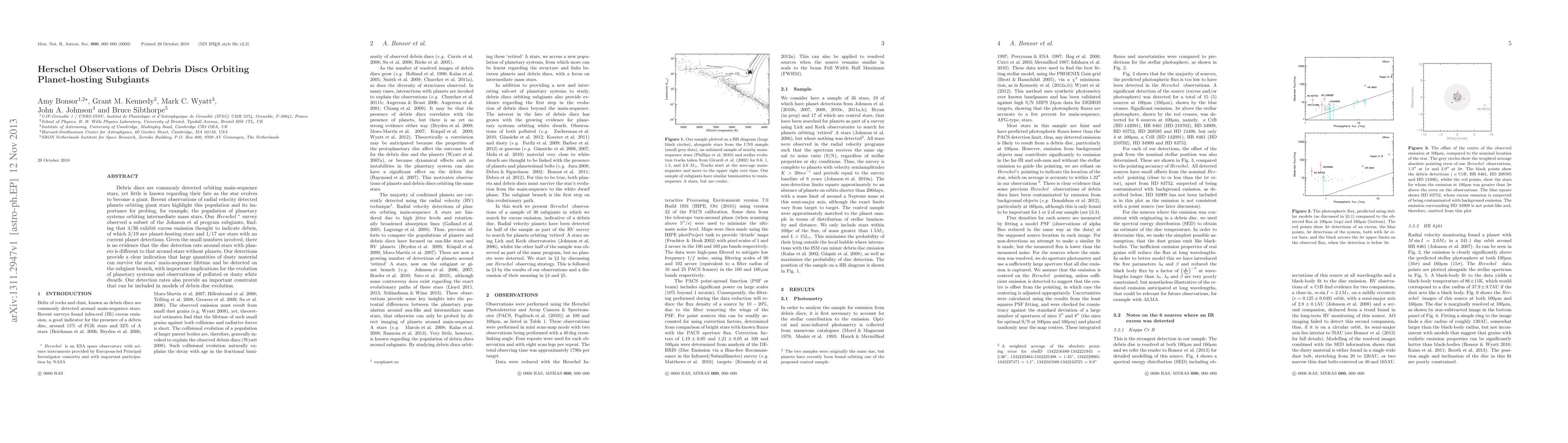 The Herschel survey found that 4 out of 36 subgiant stars exhibit debris disc emission, including 3 planet-hosting stars and 1 without detected planets, indicating dusty material can survive into the subgiant phase. There is no evidence that the presence of planets affects the disc detection rate.