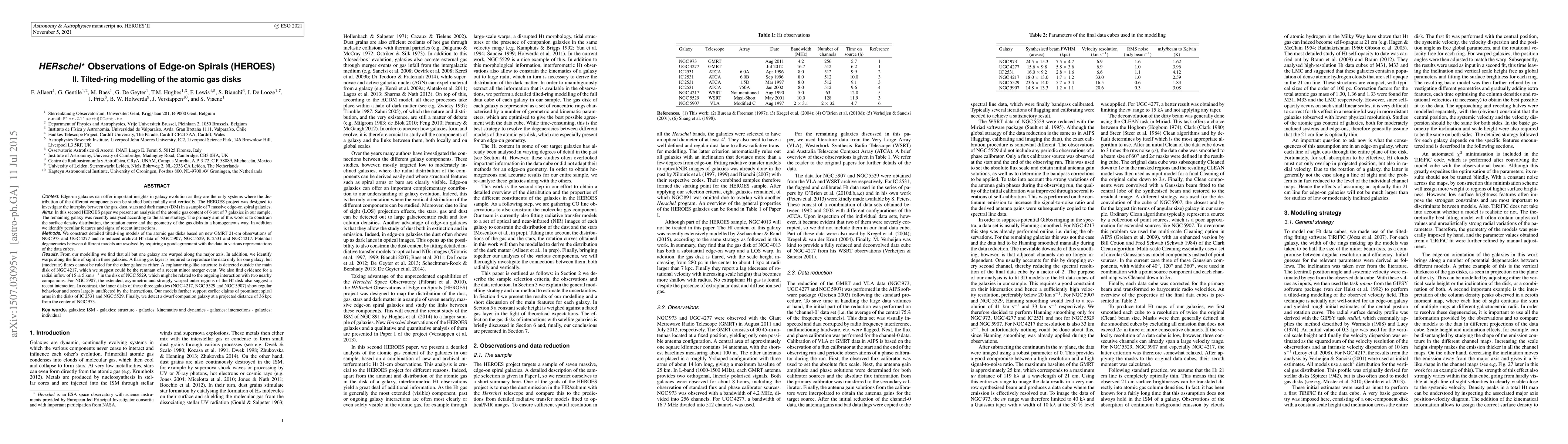 Context. Edge-on galaxies can offer important insights in galaxy evolution as they are the only systems where the distribution of the different components can be studied both radially and vertically. The HEROES project was designed to investigate the interplay between the gas, dust, stars and dark matter (DM) in a sample of 7 massive edge-on spiral galaxies. Aims. In this second HEROES paper we present an analysis of the atomic gas content of 6 out of 7 galaxies in our sample. The remaining galaxy was recently analysed according to the same strategy. The primary aim of this work is to constrain the surface density distribution, the rotation curve and the geometry of the gas disks in a homogeneous way. In addition we identify peculiar features and signs of recent interactions. Methods. We construct detailed tilted-ring models of the atomic gas disks based on new GMRT 21-cm observations of NGC 973 and UGC 4277 and re-reduced archival HI data of NGC 5907, NGC 5529, IC 2531 and NGC 4217. Potential degeneracies between different models are resolved by requiring a good agreement with the data in various representations of the data cubes. Results. From our modelling we find that all but one galaxy are warped along the major axis. In addition, we identify warps along the line of sight in three galaxies. A flaring gas layer is required to reproduce the data only for one galaxy, but (moderate) flares cannot be ruled for the other galaxies either. A coplanar ring-like structure is detected outside the main disk of NGC 4217, which we suggest could be the remnant of a recent minor merger event. We also find evidence for a radial inflow of 15 +- 5 km/s in the disk of NGC 5529, which might be related to the ongoing interaction with two nearby companions. (Abridged)