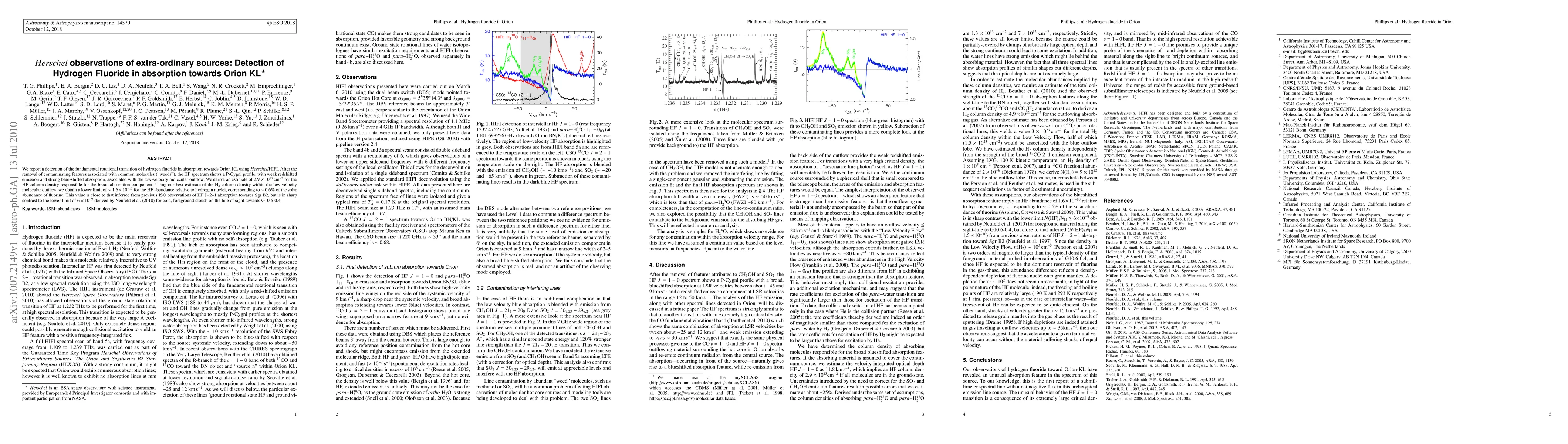 This paper reports the detection of hydrogen fluoride (HF) in absorption towards Orion KL using Herschel/HIFI, revealing a P-Cygni profile indicative of outflow dynamics. The derived HF abundance relative to hydrogen nuclei is approximately 1.6 x 10^-10, aligning with previous findings but contrasting with lower limits found in cold foreground clouds.
