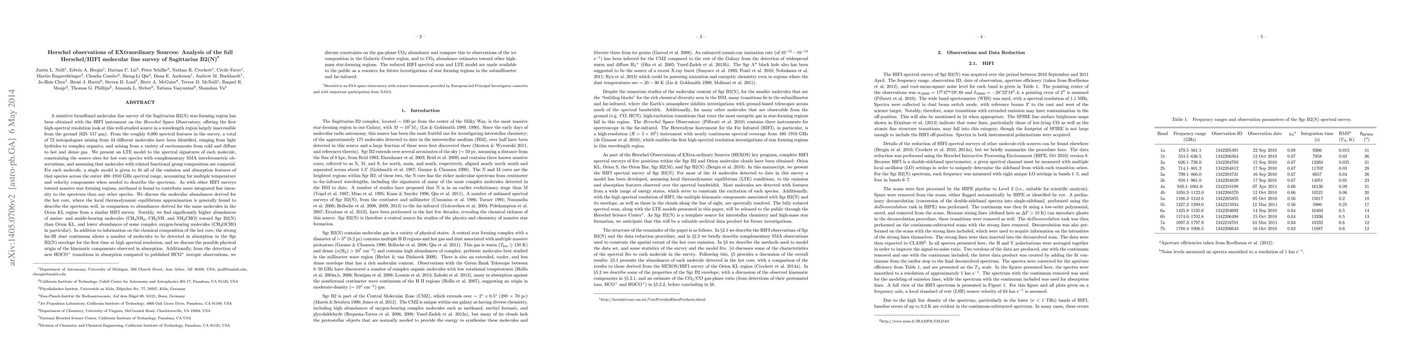 This paper reports on a detailed molecular line survey of the Sagittarius B2(N) star-forming region using the Herschel Space Observatory's HIFI instrument, identifying 72 isotopologues from 44 molecules. The study employs an LTE model to analyze spectral signatures, revealing complex organics and diverse environmental conditions, with methanol showing the most integrated line intensity.
