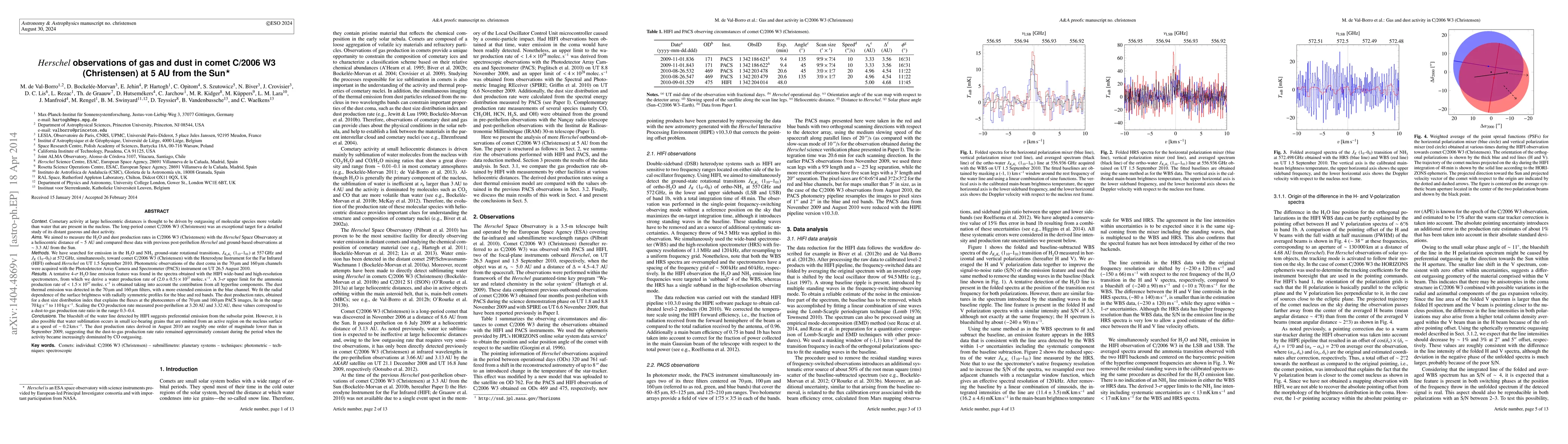 We aimed to measure the H2O and dust production rates in C/2006 W3 (Christensen) with the Herschel Space Observatory at a heliocentric distance of ~ 5 AU. We have searched for emission in the H2O and NH3 ground-state rotational transitions at 557 GHz and 572 GHz, simultaneously, with HIFI onboard Herschel on UT 1.5 September 2010. Photometric observations of the dust coma in the 70 and 160 {\mu}m channels were acquired with the PACS instrument on UT 26.5 August 2010. A tentative 4-{\sigma} H2O line emission feature was found in the spectra obtained with the HIFI wide-band and high-resolution spectrometers, from which we derive a water production rate of $2.0(5) \times 10^{27}$ molec. s$^{-1}$. A 3-{\sigma} upper limit for the ammonia production rate of <$1.5 \times 10^{27}$ molec. s$^{-1}$ is obtained taking into account the contribution from all hyperfine components. The blueshift of the water line detected by HIFI suggests preferential emission from the subsolar point. However, it is also possible that water sublimation occurs in small ice-bearing grains that are emitted from an active region on the nucleus surface at a speed of ~ 0.2 km s$^{-1}$. The dust thermal emission was detected in the 70 and 160 {\mu}m filters, with a more extended emission in the blue channel. The dust production rates, obtained for a dust size distribution index that explains the fluxes at the photocenters of the PACS images, lie in the range 70-110 kg s$^{-1}$. Scaling the CO production rate measured post-perihelion at 3.20 and 3.32 AU, these values correspond to a dust-to-gas production rate ratio in the range 0.3-0.4. The dust production rates derived in August 2010 are roughly one order of magnitude lower than in September 2009, suggesting that the dust-to-gas production rate ratio remained approximately constant during the period when the activity became increasingly dominated by CO outgassing.