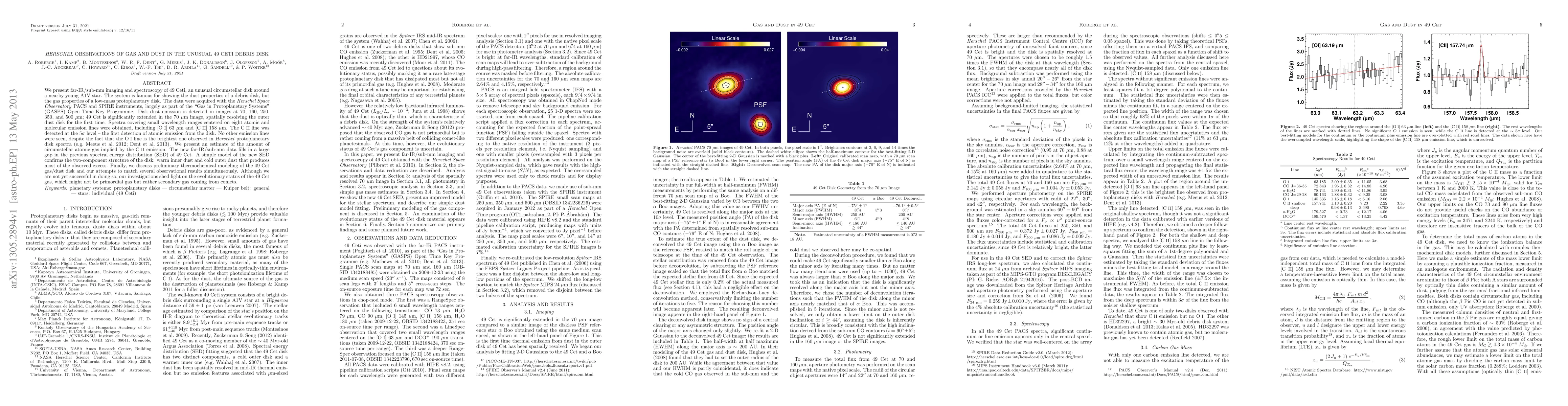 This paper presents Herschel observations of the unusual debris disk around 49 Ceti, revealing the first detection of atomic emission from the disk via the [CII] 158 μm line. The study detects dust emission across multiple wavelengths and finds evidence suggesting the disk's gas may be secondary, possibly from cometary sources, rather than primordial.