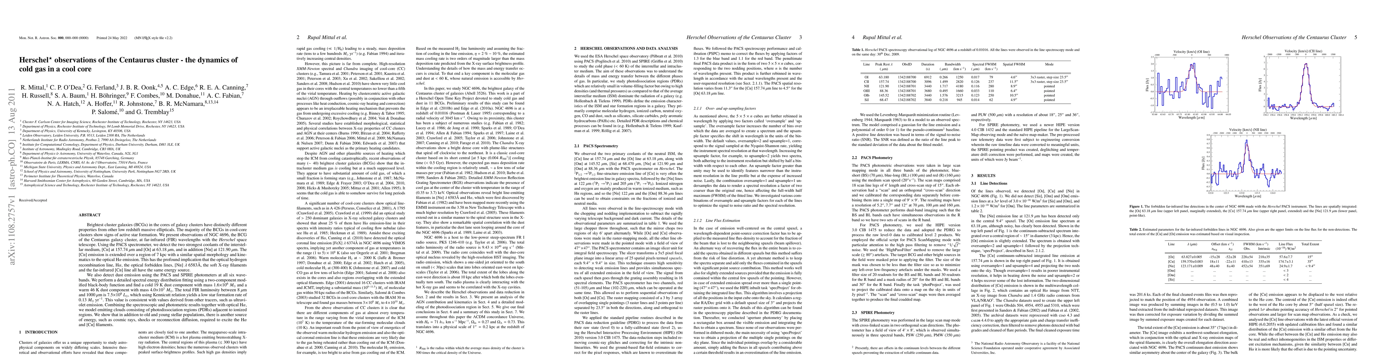 This study uses Herschel observations to analyze the dynamics of cold gas in the Centaurus cluster's brightest cluster galaxy (BCG), NGC 4696. The research detects CII, OI, and NII emissions, indicating active star formation and the presence of both cold and warm dust components, suggesting additional energy sources like cosmic rays or shocks are needed to excite the observed gas.