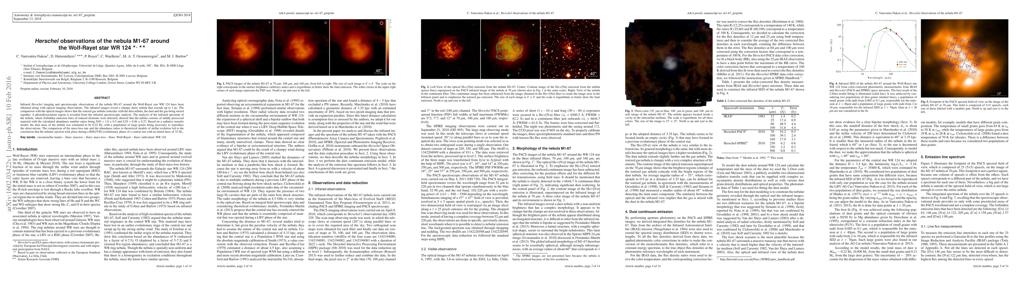 Herschel observations of the M1-67 nebula around the Wolf-Rayet star WR 124 reveal a clumpy dusty structure mixed with ionized gas, indicating a photodissociation region. The nebula's infrared spectrum suggests mildly processed material, with dust mass estimated at 0.22 Msun, and its ejection likely occurred during a red supergiant/yellow supergiant phase of a star with an initial mass of 32 Msun.