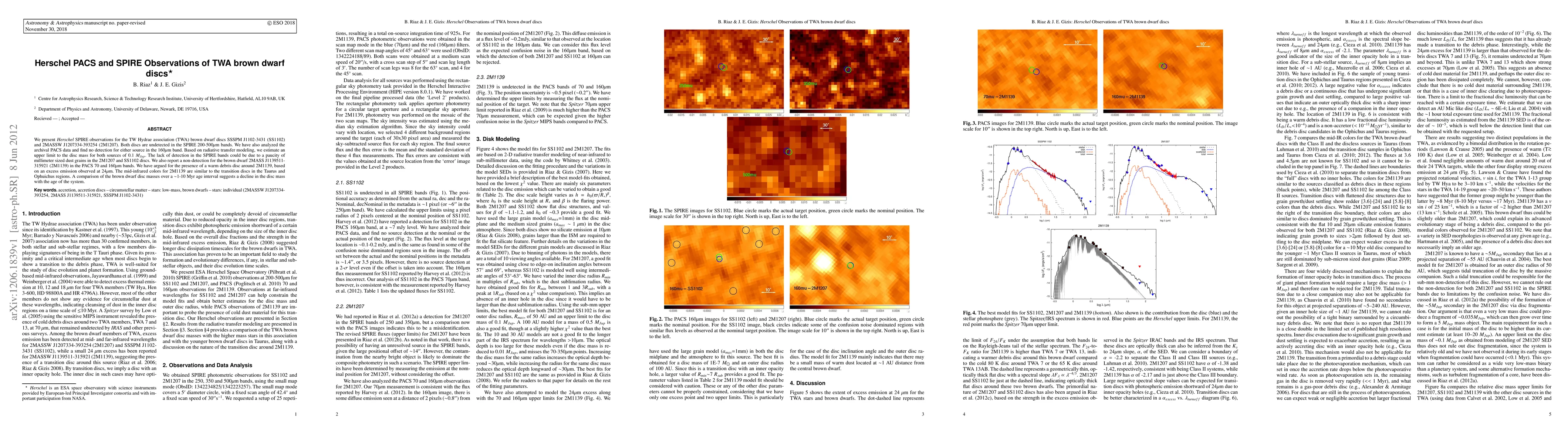 This study uses Herschel PACS and SPIRE observations to analyze brown dwarf discs in the TWA association, finding no significant infrared emission from discs SS1102 and 2M1207, suggesting minimal millimeter-sized dust. A warm debris disc is inferred around 2M1139 based on excess 24µm emission, while disc mass declines with the age of the system.