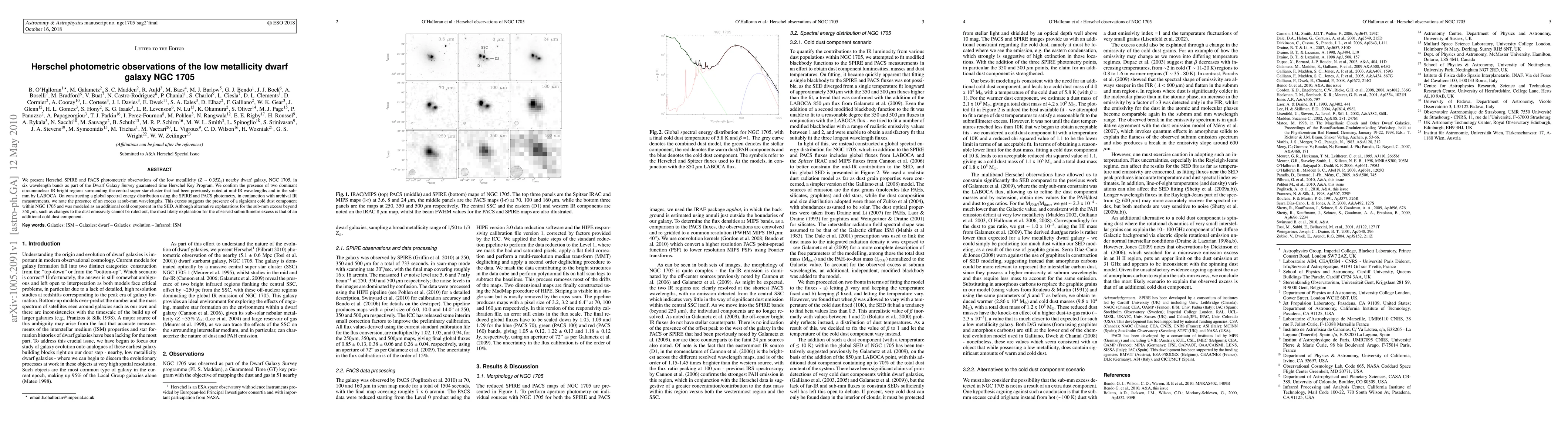 This study uses Herschel telescope data to observe NGC 1705, a low-metallicity dwarf galaxy, finding two IR-bright regions around its central super star cluster and an excess of sub-mm radiation suggesting the presence of cold dust.