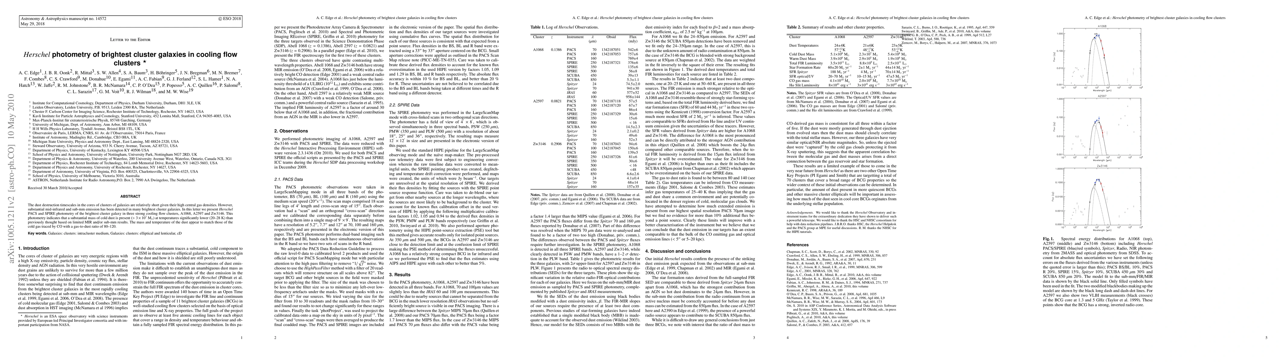 The dust destruction timescales in the cores of clusters of galaxies are relatively short given their high central gas densities. However, substantial mid-infrared and sub-mm emission has been detected in many brightest cluster galaxies. In this letter we present Herschel PACS and SPIRE photometry of the brightest cluster galaxy in three strong cooling flow clusters, A1068, A2597 and Zw3146. This photometry indicates that a substantial mass of cold dust is present (>3 x 10^7 Mo) at temperatures significantly lower (20-28K) than previously thought based on limited MIR and/or sub-mm results. The mass and temperature of the dust appear to match those of the cold gas traced by CO with a gas-to-dust ratio of 80-120.