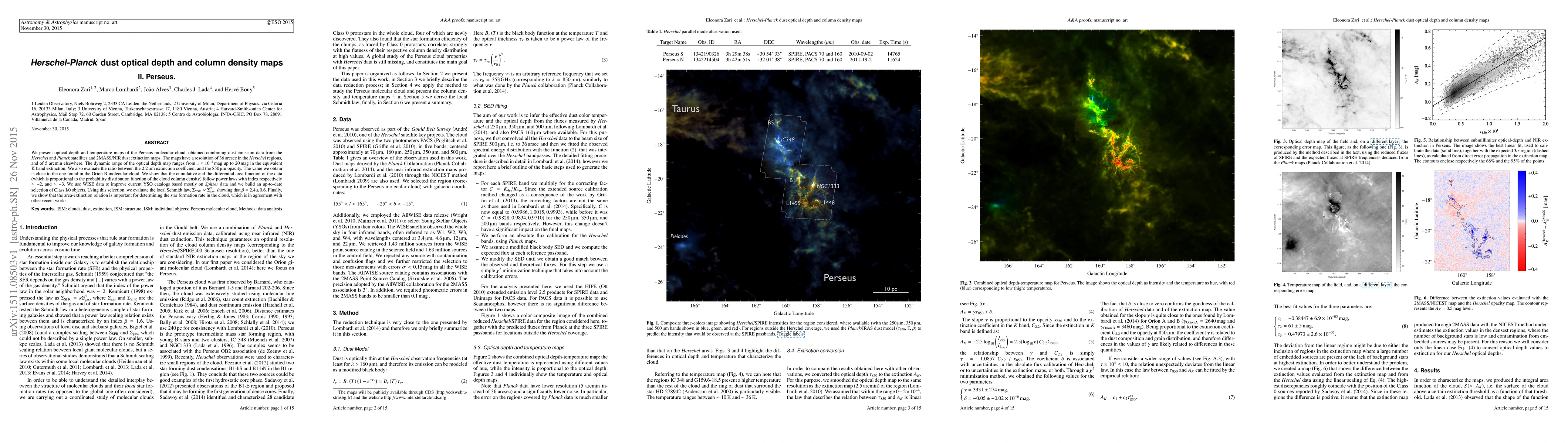 This paper presents optical depth and temperature maps of the Perseus molecular cloud using data from Herschel, Planck, and 2MASS, revealing a dynamic range in extinction from $1\times10^{-2}$ to $20$ mag. It also evaluates the star formation rate in the cloud, finding a local Schmidt law exponent of $\beta=2.4 \pm 0.6$.