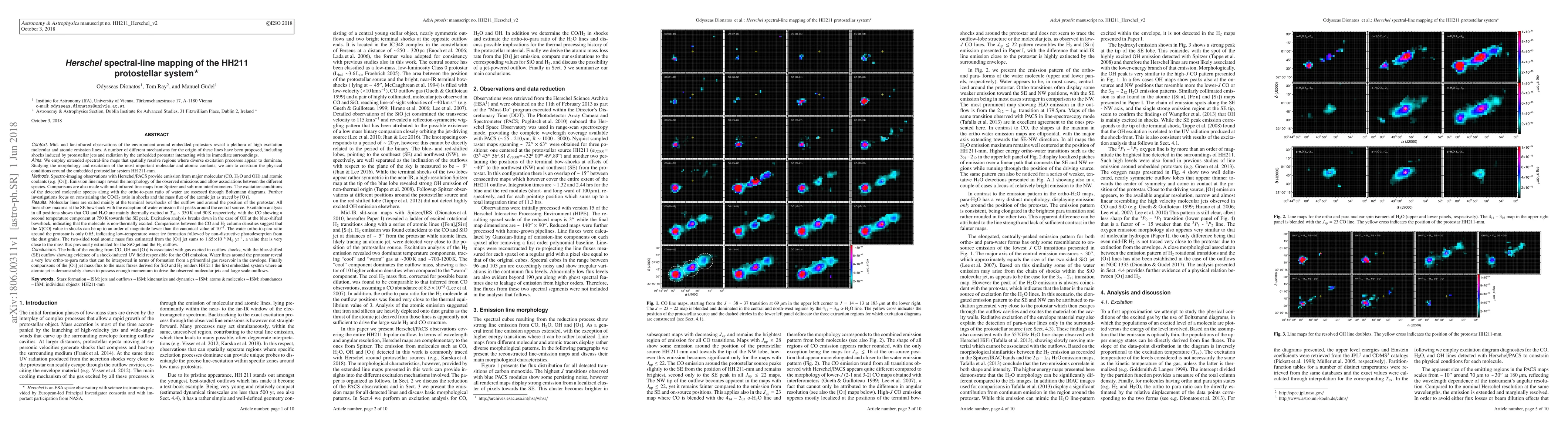 (Abridged) Mid- and far-infrared observations of the environment around embedded protostars reveal a plethora of high excitation molecular and atomic emission lines. In this work we present spectro-imaging observations of the HH211 system with Herschel/PACS that record emission from major molecular (CO, H2O and OH) and atomic coolants (e.g. [OI]). Molecular lines are mainly exited at the terminal bowshocks of the outflow and around the position of the protostar. All lines show maxima at the southeast bowshock with the exception of water emission that peaks around the central source. Excitation analysis in all positions shows that CO and H$_2$O are mainly thermally excited at T~ 350 K and 90 K respectively, with the CO showing a second temperature component at 750 K towards the southeast peak. Excitation analysis breaks down in the case of OH, indicating that the molecule is non-thermally excited. Comparisons between the CO and H2 column densities suggest that the CO abundance value in shocks can be up to an order of magnitude lower than the canonical value of 10$^{-4}$. The water ortho-to-para ratio around the protostar is only 0.65, indicating low-temperature water ice formation followed by non-destructive photodesorption from the dust grains. Therefore the low ortho-to-para ratio in water that can be interpreted in terms of formation from a primordial gas reservoir in the protostellar envelope. The two-sided total atomic mass flux estimated from the [OI] jet sums to 1.65$\times 10^{-6}$ M$_{\odot}$ yr$^{-1}$, a value that is very close to the mass flux previously estimated for the SiO jet and the H$_2$ outflow. These comparisons render HH211 the first embedded system where an atomic jet is demonstrably shown to possess enough momentum to drive the observed molecular jets and large scale outflows.