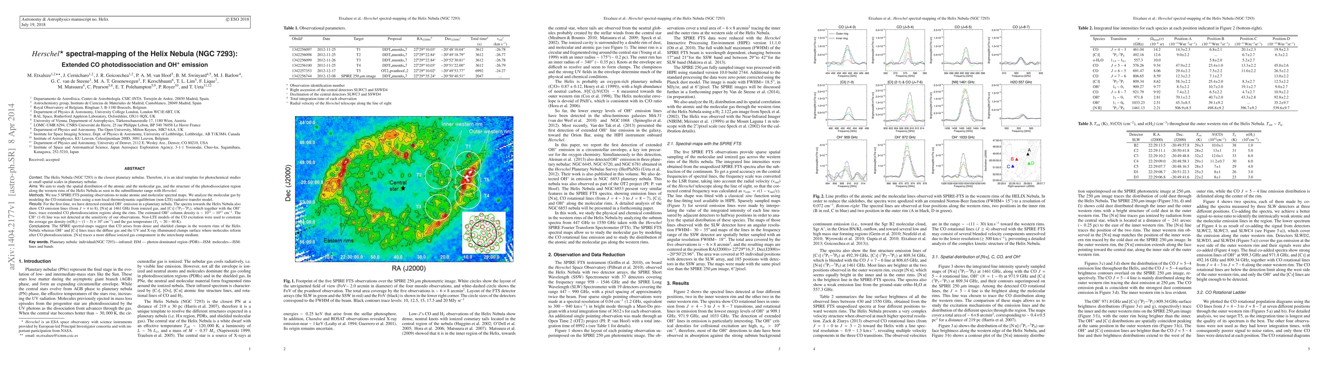 The Herschel spectral-mapping of the Helix Nebula reveals extended CO photodissociation and OH+ emission, with CO arising from dense clumps and OH+ tracing UV and X-ray illuminated regions where molecules reform after CO photodissociation. The study also detected [NII] and [CI] lines, providing insights into the nebula's ionized gas and molecular structure.