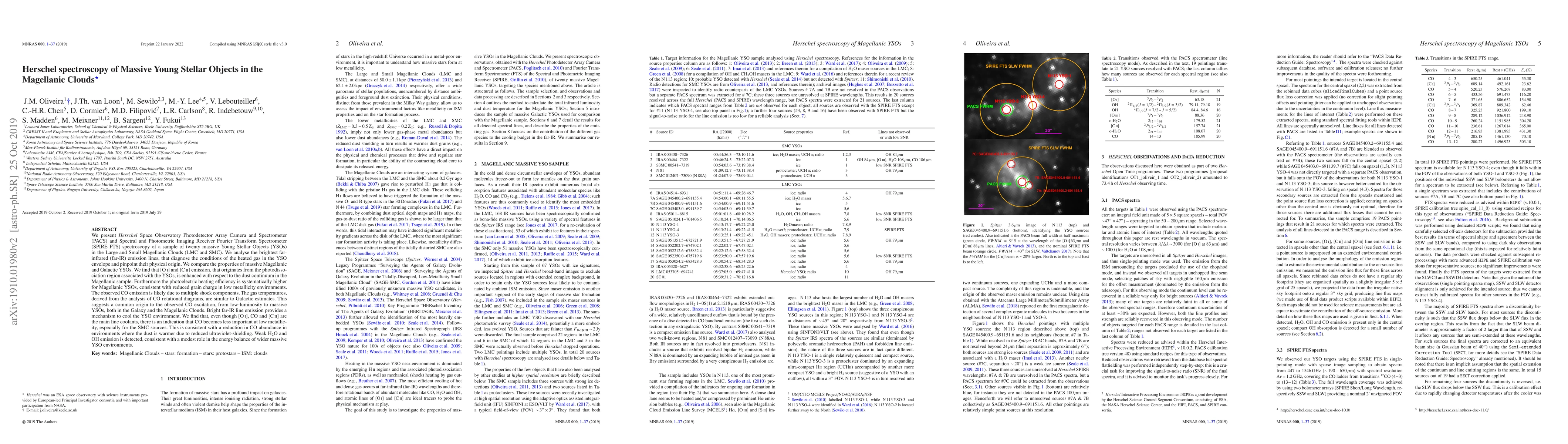 This study uses Herschel Space Observatory data to analyze far-infrared emission lines from 20 massive young stellar objects in the Magellanic Clouds, revealing enhanced [OI] and [CII] emissions and higher photoelectric heating efficiency compared to Galactic YSOs, likely due to lower metallicity environments. The study finds a common origin for CO excitation in both the Galaxy and the Magellanic Clouds, though CO's cooling role diminishes in low metallicity environments.