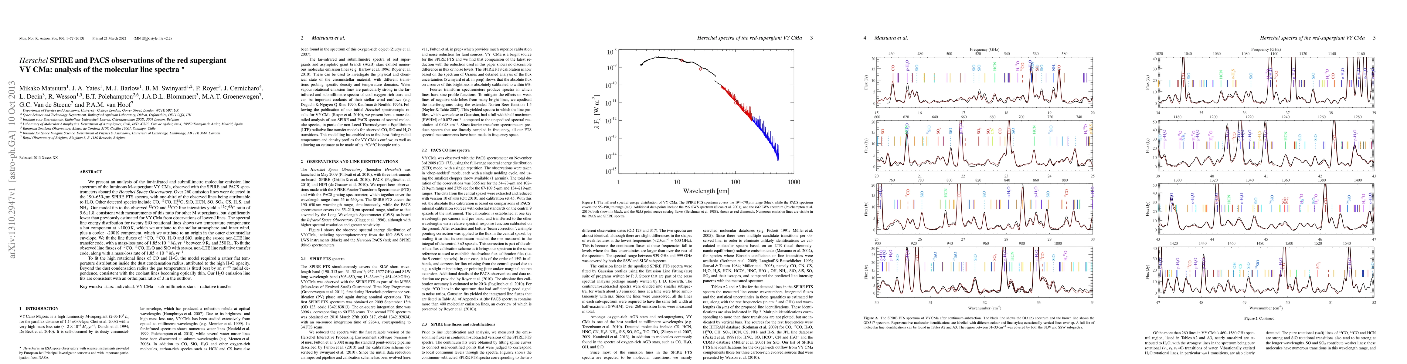 This paper analyzes the far-infrared and submillimetre molecular emission lines of the red supergiant VY CMa using Herschel SPIRE and PACS data, detecting over 260 lines, with H2O being most prominent. The study finds a 12C/13C ratio of 5.6±1.8 and models the circumstellar envelope with a mass-loss rate of 1.85x10^-4 Msun yr^-1.