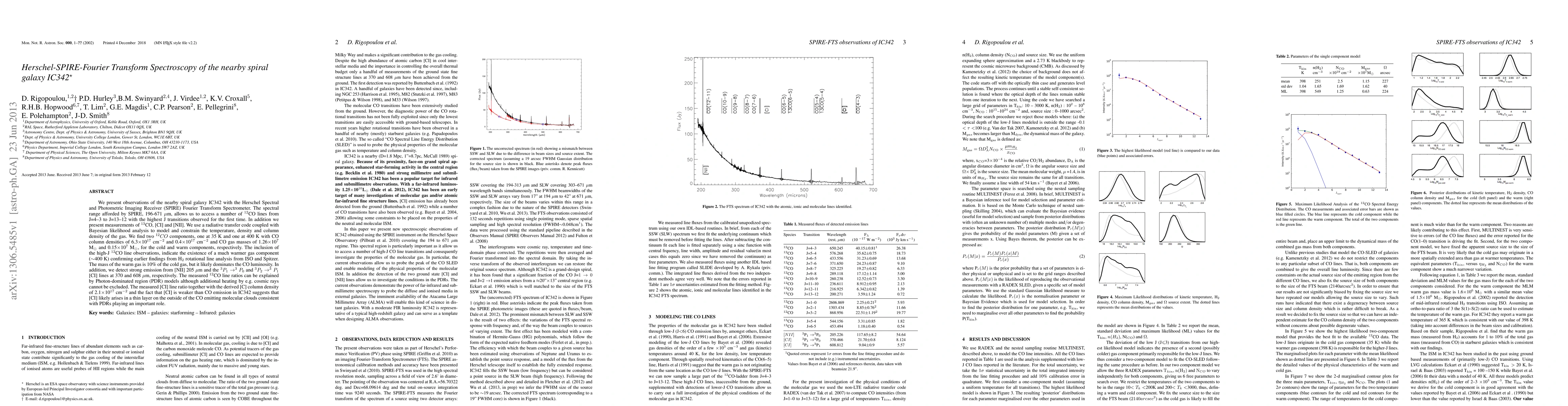 We present observations of the nearby spiral galaxy IC342 with the Herschel Spectral and Photometric Imaging Receiver (SPIRE) Fourier Transform Spectrometer. The spectral range afforded by SPIRE, 196-671 microns, allows us to access a number of 12CO lines from J=4--3 to J=13--12 with the highest J transitions observed for the first time. In addition we present measurements of 13CO, [CI] and [NII]. We use a radiative transfer code coupled with Bayesian likelihood analysis to model and constrain the temperature, density and column density of the gas. We find two 12CO components, one at 35 K and one at 400 K with CO column densities of 6.3x10^{17} cm^{-2} and 0.4x10^{17} cm^{-2} and CO gas masses of 1.26x10^{7} Msolar and 0.15x10^{7} Msolar, for the cold and warm components, respectively. The inclusion of the high-J 12CO line observations, indicate the existence of a much warmer gas component (~400 K) confirming earlier findings from H_{2} rotational line analysis from ISO and Spitzer. The mass of the warm gas is 10% of the cold gas, but it likely dominates the CO luminosity. In addition, we detect strong emission from [NII] 205microns and the {3}P_{1}->{3}P_{0} and {3}P_{2} ->{3}P_{1} [CI] lines at 370 and 608 microns, respectively. The measured 12CO line ratios can be explained by Photon-dominated region (PDR) models although additional heating by e.g. cosmic rays cannot be excluded. The measured [CI] line ratio together with the derived [C] column density of 2.1x10^{17} cm^{-2} and the fact that [CI] is weaker than CO emission in IC342 suggests that [CI] likely arises in a thin layer on the outside of the CO emitting molecular clouds consistent with PDRs playing an important role.