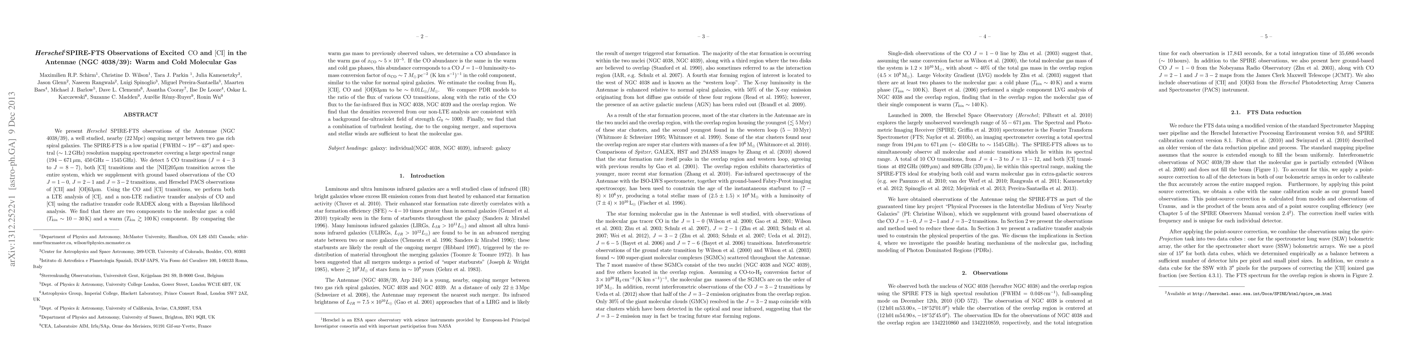 This paper uses Herschel SPIRE-FTS observations to analyze the molecular gas in the Antennae galaxies (NGC 4038/39), identifying both cold ($T_{kin}\sim 10-30$ K) and warm ($T_{kin} \gtrsim 100$ K) components. The study finds a CO abundance in the warm gas and a CO $J=1-0$ luminosity-to-mass conversion factor of $\alpha_{CO} \sim 7 \ M_{\odot}{pc^{-2} \ (K \ km \ s^{-1})^{-1}}$ in the cold component, consistent with normal spiral galaxies.