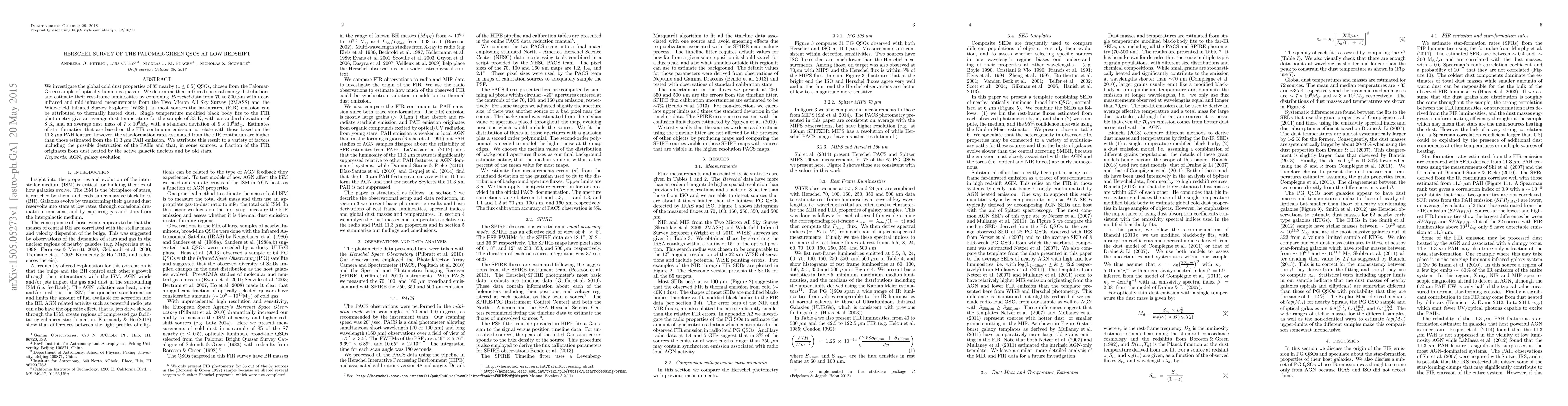 We investigate the global cold dust properties of 85 nearby (z < 0.5) QSOs, chosen from the Palomar-Green sample of optically luminous quasars. We determine their infrared spectral energy distributions and estimate their rest-frame luminosities by combining Herschel data from 70 to 500 microns with near-infrared and mid-infrared measurements from the Two Micron All Sky Survey (2MASS) and the Wide-Field Infrared Survey Explorer (WISE). In most sources the far-infrared (FIR) emission can be attributed to thermally heated dust. Single temperature modified black body fits to the FIR photometry give an average dust temperature for the sample of 33~K, with a standard deviation of 8~K, and an average dust mass of 7E6 Solar Masses with a standard deviation of 9E6 Solar Masses. Estimates of star-formation that are based on the FIR continuum emission correlate with those based on the 11.3 microns PAH feature, however, the star-formation rates estimated from the FIR continuum are higher than those estimated from the 11.3 microns PAH emission. We attribute this result to a variety of factors including the possible destruction of the PAHs and that, in some sources, a fraction of the FIR originates from dust heated by the active galactic nucleus and by old stars.