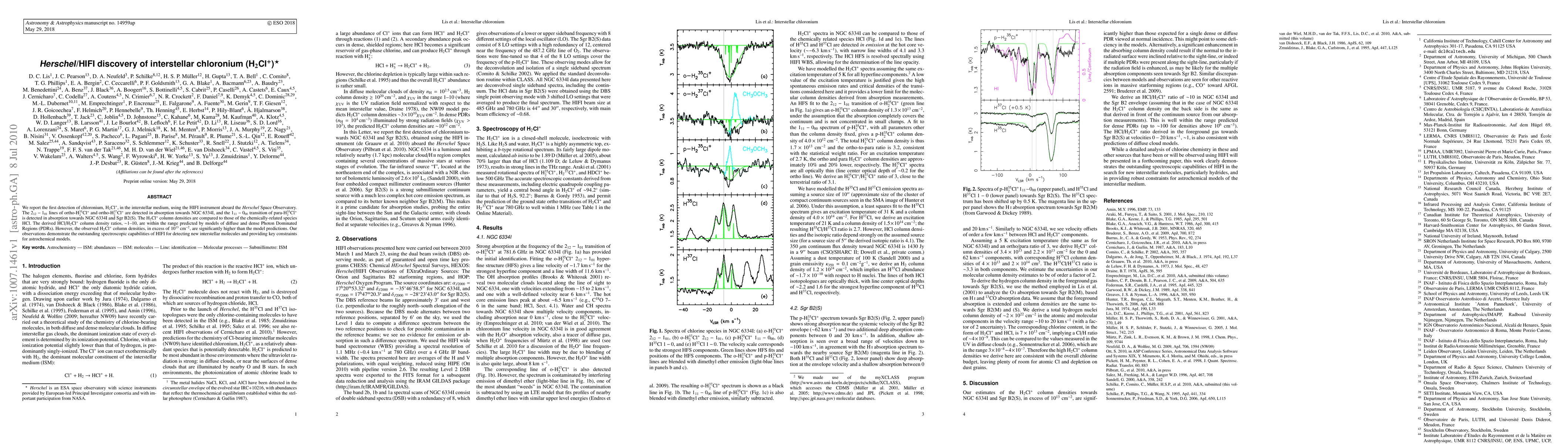 We report the first detection of chloronium, H$_2$Cl$^+$, in the interstellar medium, using the HIFI instrument aboard the \emph{Herschel} Space Observatory. The $2_{12}-1_{01}$ lines of ortho-H$_2^{35}$Cl$^+$ and ortho-H$_2^{37}$Cl$^+$ are detected in absorption towards NGC~6334I, and the $1_{11}-0_{00}$ transition of para-H$_2^{35}$Cl$^+$ is detected in absorption towards NGC~6334I and Sgr~B2(S). The H$_2$Cl$^+$ column densities are compared to those of the chemically-related species HCl. The derived HCl/H$_2$Cl$^+$ column density ratios, $\sim$1--10, are within the range predicted by models of diffuse and dense Photon Dominated Regions (PDRs). However, the observed H$_2$Cl$^+$ column densities, in excess of $10^{13}$~cm$^{-2}$, are significantly higher than the model predictions. Our observations demonstrate the outstanding spectroscopic capabilities of HIFI for detecting new interstellar molecules and providing key constraints for astrochemical models.