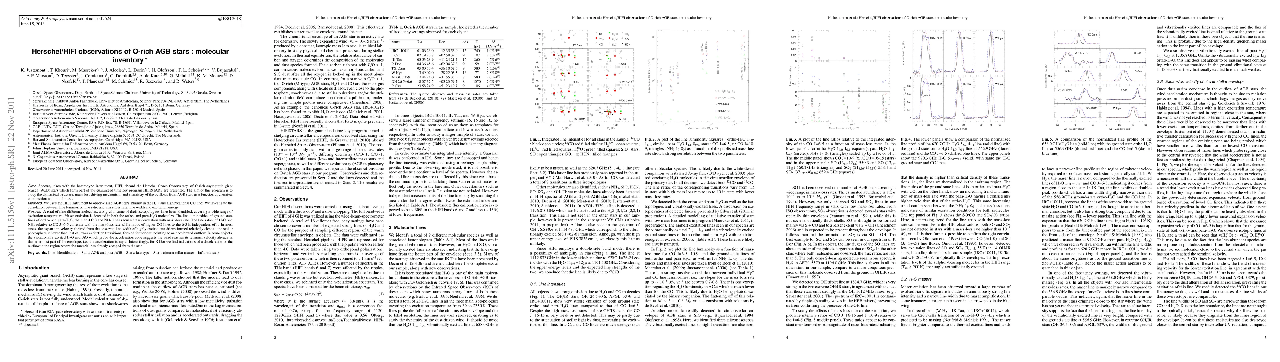 Spectra, taken with the heterodyne instrument, HIFI, aboard the Herschel Space Observatory, of O-rich asymptotic giant branch (AGB) stars which form part of the guaranteed time key program HIFISTARS are presented. The aim of this program is to study the dynamical structure, mass-loss driving mechanism, and chemistry of the outflows from AGB stars as a function of chemical composition and initial mass. We used the HIFI instrument to observe nine AGB stars, mainly in the H2O and high rotational CO lines We investigate the correlation between line luminosity, line ratio and mass-loss rate, line width and excitation energy. A total of nine different molecules, along with some of their isotopologues have been identified, covering a wide range of excitation temperature. Maser emission is detected in both the ortho- and para-H2O molecules. The line luminosities of ground state lines of ortho- and para-H2O, the high-J CO and NH3 lines show a clear correlation with mass-loss rate. The line ratios of H2O and NH3 relative to CO J=6-5 correlate with the mass-loss rate while ratios of higher CO lines to the 6-5 is independent of it. In most cases, the expansion velocity derived from the observed line width of highly excited transitions formed relatively close to the stellar photosphere is lower than that of lower excitation transitions, formed farther out, pointing to an accelerated outflow. In some objects, the vibrationally excited H2O and SiO which probe the acceleration zone suggests the wind reaches its terminal velocity already in the innermost part of the envelope, i.e., the acceleration is rapid. Interestingly, for R Dor we find indications of a deceleration of the outflow in the region where the material has already escaped from the star.
