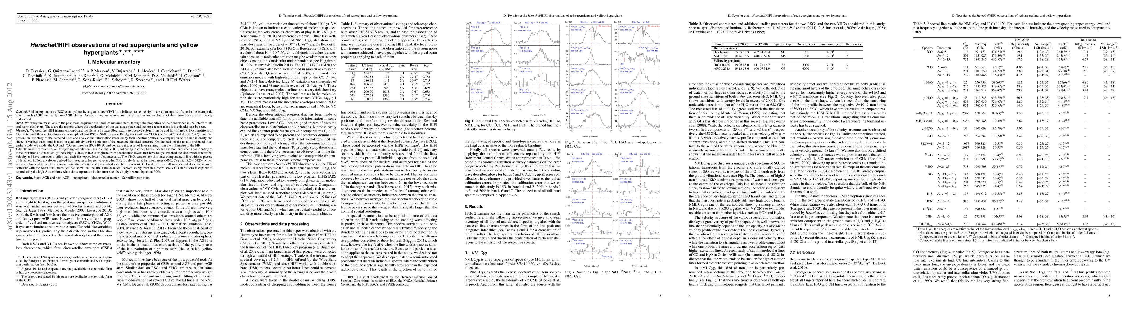 Red supergiant stars (RSGs) and yellow hypergiant stars (YHGs) are believed to be the high-mass counterparts of stars in the AGB and early post-AGB phases. We study the mass-loss in the post main-sequence evolution of massive stars, through the properties of their envelopes in the intermediate and warm gas layers. These are the regions where the acceleration of the gas takes place and the most recent mass-loss episodes can be seen. We used the HIFI instrument on-board the Herschel Space Observatory to observe sub-mm and FIR transitions of CO, water, and their isotopologues in a sample of two RSGs (NML Cyg and Betelgeuse) and two YHGs (IRC+10420 and AFGL 2343) stars. We present an inventory of the detected lines and analyse the information revealed by their spectral profiles. On the basis of the results presented in an earlier study, we model the CO and 13CO emission in IRC+10420 and compare it to a set of lines ranging from the mm, to the FIR. Red supergiants have stronger high-excitation lines than the YHGs, indicating that they harbour dense and hot inner shells contributing to these transitions. Consequently, these high-J lines in RSGs originate from acceleration layers that have not yet reached the circumstellar terminal velocity and have narrower profiles than their flat-topped lower-J counterparts. The YHGs tend to lack this inner component, in line with the picture of detached, hollow envelopes derived from studies at longer wavelengths. NH3 is only detected in two sources (NML Cyg, IRC+10420), which are also observed to be the strongest water-line emitters of the studied sample. In contrast, OH is detected in all sources and does not seem to correlate with the water line intensities. We show that the IRC+10420 model derived solely from mm low-J CO transitions is capable of reproducing the high-J transitions when the temperature in the inner shell is simply lowered by about 30%.
