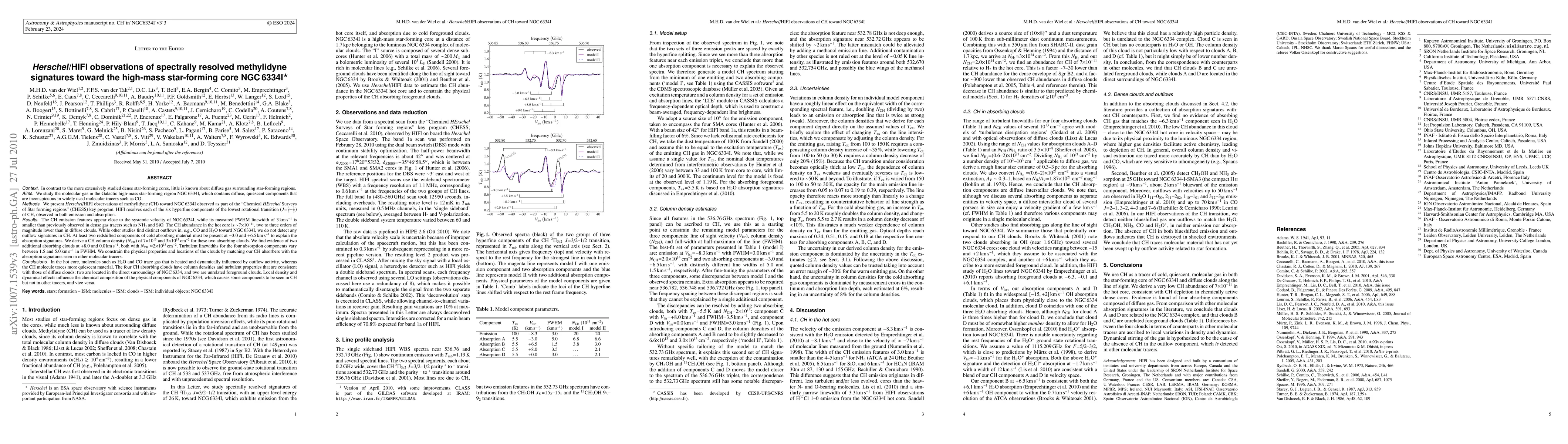 In contrast to extensively studied dense star-forming cores, little is known about diffuse gas surrounding star-forming regions. We study molecular gas in the high-mass star-forming region NGC6334I, which contains diffuse, quiescent components that are inconspicuous in widely used molecular tracers such as CO. We present Herschel/HIFI observations of CH toward NGC6334I observed as part of the CHESS key program. HIFI resolves the hyperfine components of its J=3/2-1/2 transition, observed in both emission and absorption. The CH emission appears close to the systemic velocity of NGC6334I, while its measured linewidth of 3 km/s is smaller than previously observed in dense gas tracers such as NH3 and SiO. The CH abundance in the hot core is 7 10^-11, two to three orders of magnitude lower than in diffuse clouds. While other studies find distinct outflows in, e.g., CO and H2O toward NGC6334I, we do not detect outflow signatures in CH. To explain the absorption signatures, at least two absorbing components are needed at -3.0 and +6.5 km/s with N(CH)=7 10^13 and 3 10^13 cm^-2. Two additional absorbing clouds are found at +8.0 and 0.0 km/s, both with N(CH)=2 10^13 cm^-2. Turbulent linewidths for the four absorption components vary between 1.5 and 5.0 km/s in FWHM. We constrain physical properties of our CH clouds by matching our CH absorbers with other absorption signatures. In the hot core, molecules such as H2O and CO trace gas that is heated and dynamically influenced by outflow activity, whereas CH traces more quiescent material. The four CH absorbers have column densities and turbulent properties consistent with diffuse clouds: two are located near NGC6334, and two are unrelated foreground clouds. Local density and dynamical effects influence the chemical composition of physical components of NGC6334, causing some components to be seen in CH but not in other tracers, and vice versa.