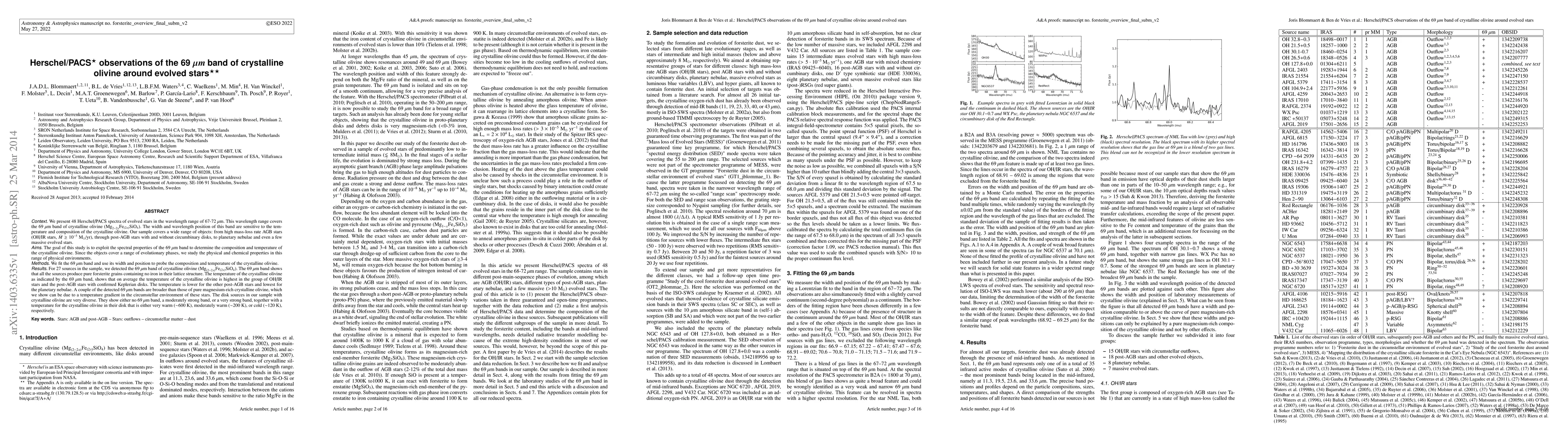 We present 48 Herschel/PACS spectra of evolved stars in the wavelength range of 67-72 $\mu$m. This wavelength range covers the 69 $\mu$m band of crystalline olivine ($\text{Mg}_{2-2x}\text{Fe}_{(2x)}\text{SiO}_{4}$). The width and wavelength position of this band are sensitive to the temperature and composition of the crystalline olivine. Our sample covers a wide range of objects: from high mass-loss rate AGB stars (OH/IR stars, $\dot M \ge 10^{-5}$ M$_\odot$/yr), through post-AGB stars with and without circumbinary disks, to planetary nebulae and even a few massive evolved stars. The goal of this study is to exploit the spectral properties of the 69 $\mu$m band to determine the composition and temperature of the crystalline olivine. Since the objects cover a range of evolutionary phases, we study the physical and chemical properties in this range of physical environments. We fit the 69 $\mu$m band and use its width and position to probe the composition and temperature of the crystalline olivine. For 27 sources in the sample, we detected the 69 $\mu$m band of crystalline olivine ($\text{Mg}_{(2-2x)}\text{Fe}_{(2x)}\text{SiO}_{4}$). The 69 $\mu$m band shows that all the sources produce pure forsterite grains containing no iron in their lattice structure. The temperature of the crystalline olivine as indicated by the 69 $\mu$m band, shows that on average the temperature of the crystalline olivine is highest in the group of OH/IR stars and the post-AGB stars with confirmed Keplerian disks. The temperature is lower for the other post-AGB stars and lowest for the planetary nebulae. A couple of the detected 69 $\mu$m bands are broader than those of pure magnesium-rich crystalline olivine, which we show can be due to a temperature gradient in the circumstellar environment of these stars. continued...