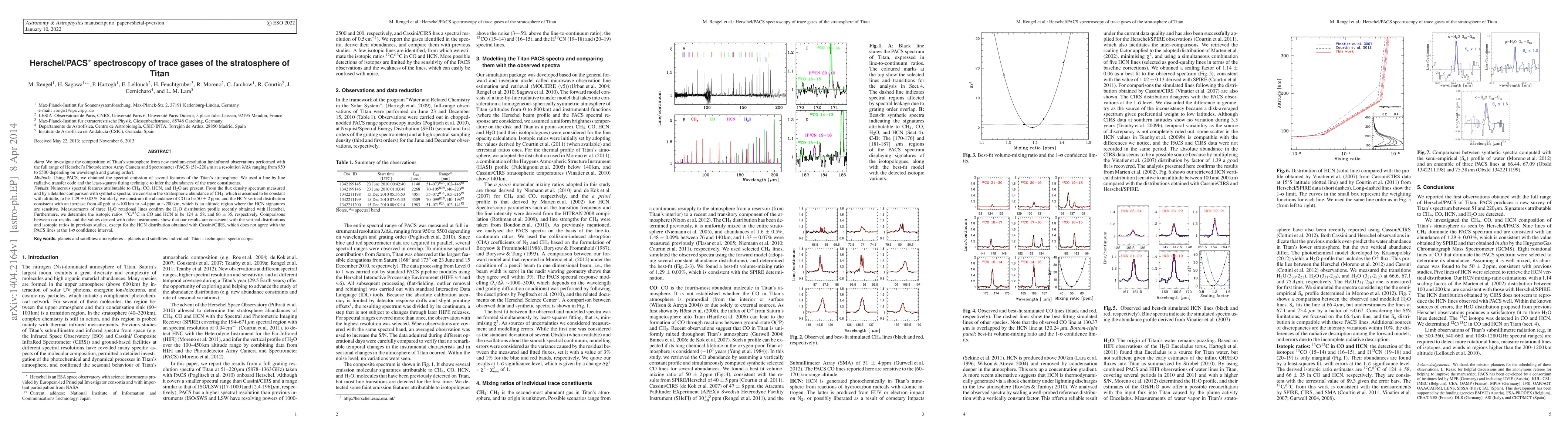 This study uses Herschel/PACS spectroscopy to analyze Titan's stratospheric composition, identifying CH$_4$, CO, HCN, and H$_2$O. The results show CH$_4$ at 1.29 $\pm$ 0.03%, CO at 50 $\pm$ 2 ppm, and an increasing HCN concentration from 40 ppb to 4 ppm with altitude, confirming previous findings except for discrepancies in HCN distribution with Cassini/CIRS data.