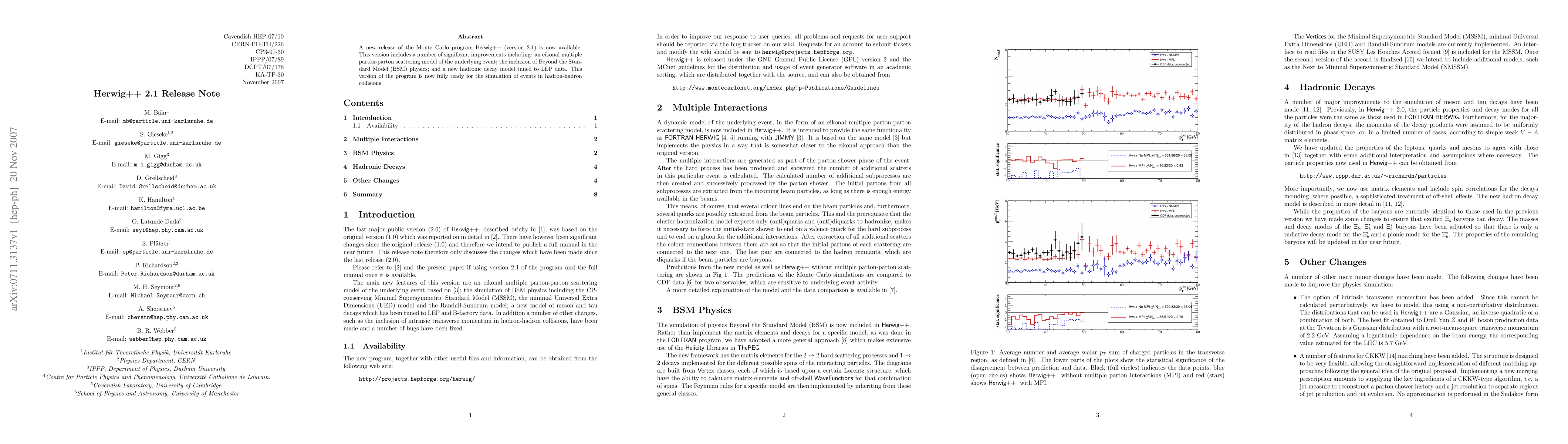 A new release of the Monte Carlo program Herwig++ (version 2.1) is now available. This version includes a number of significant improvements including: an eikonal multiple parton-parton scattering model of the underlying event; the inclusion of Beyond the Standard Model physics; and a new hadronic decay model tuned to LEP data. This version of the program is now fully ready for the simulation of events in hadron-hadron collisions.