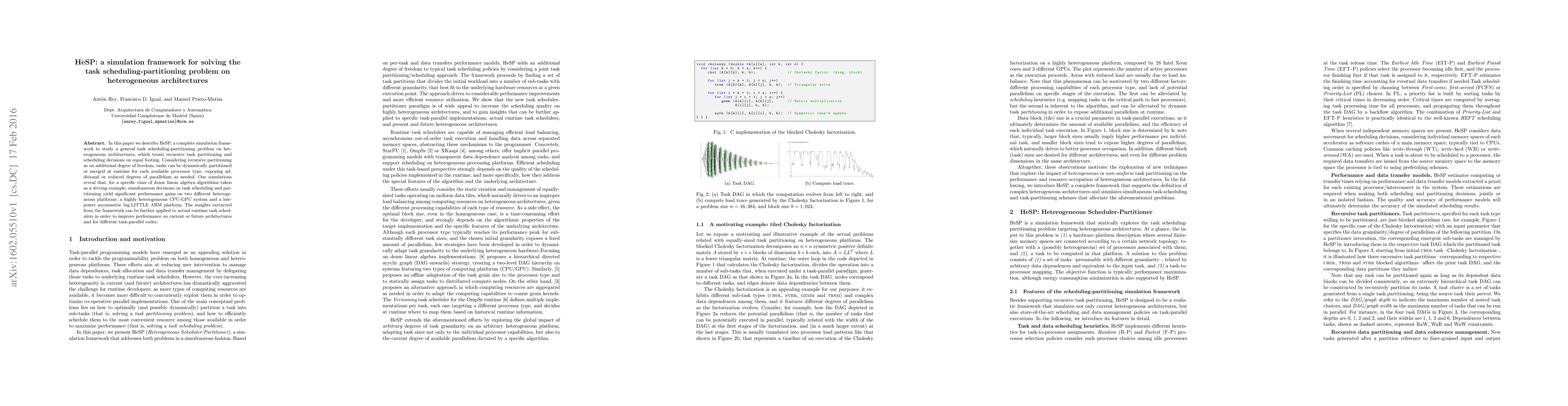 HeSP is a simulation framework for optimizing task scheduling and partitioning on heterogeneous architectures, demonstrating significant performance gains for dense linear algebra algorithms on both CPU-GPU and ARM platforms. The framework can guide improvements in runtime task schedulers for various architectures and task-parallel codes.