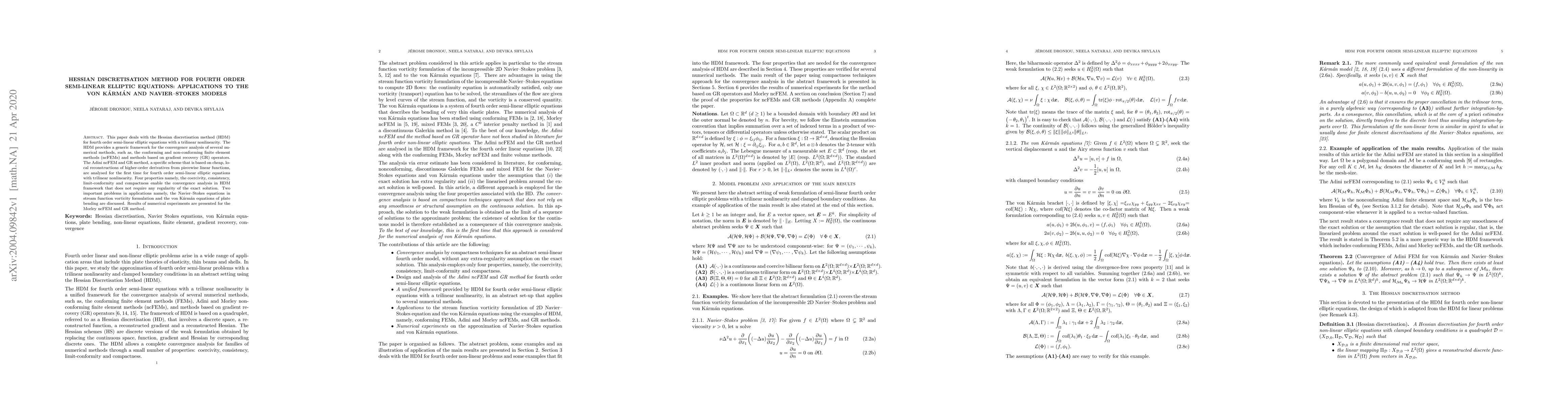 This paper introduces a Hessian discretisation method for fourth order semi-linear elliptic equations, analyzing its convergence for specific applications in Navier-Stokes and von Karmán models.