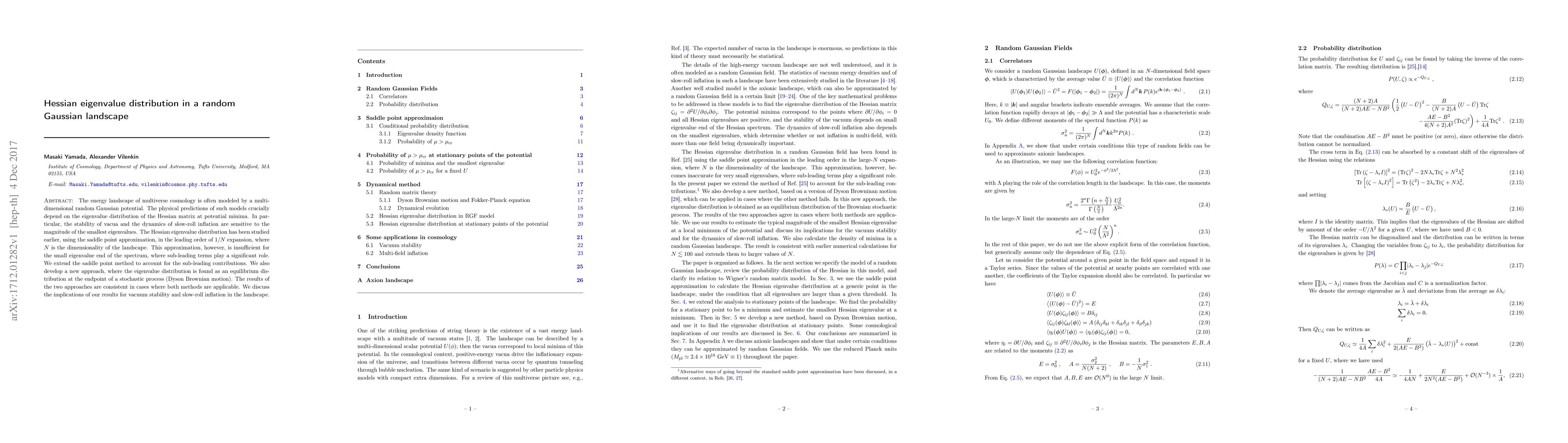 This paper investigates the Hessian eigenvalue distribution in a random Gaussian landscape, crucial for understanding vacuum stability and slow-roll inflation in multiverse cosmology. The authors extend the saddle point approximation and introduce a new method based on Dyson Brownian motion to better capture sub-leading terms, finding consistent results that have implications for cosmological dynamics.