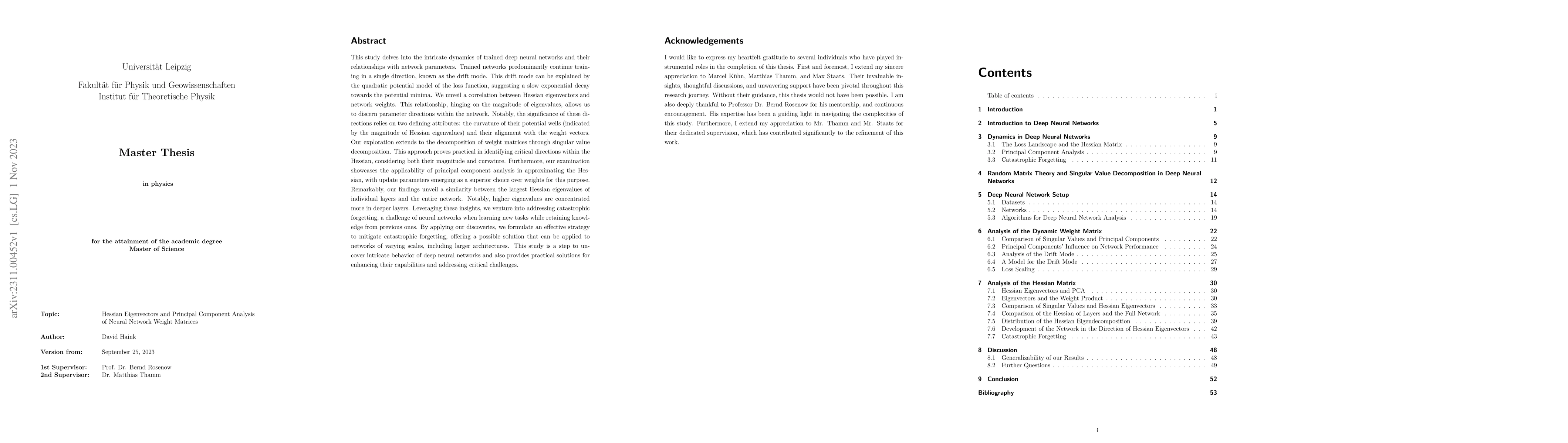 This study investigates the relationship between Hessian eigenvectors and neural network weight matrices, revealing how trained networks drift in a single direction due to the quadratic potential model of the loss function. The research highlights the significance of Hessian eigenvalues in determining critical parameter directions and proposes principal component analysis as an effective method for approximating the Hessian, ultimately offering a strategy to mitigate catastrophic forgetting in neural networks.
