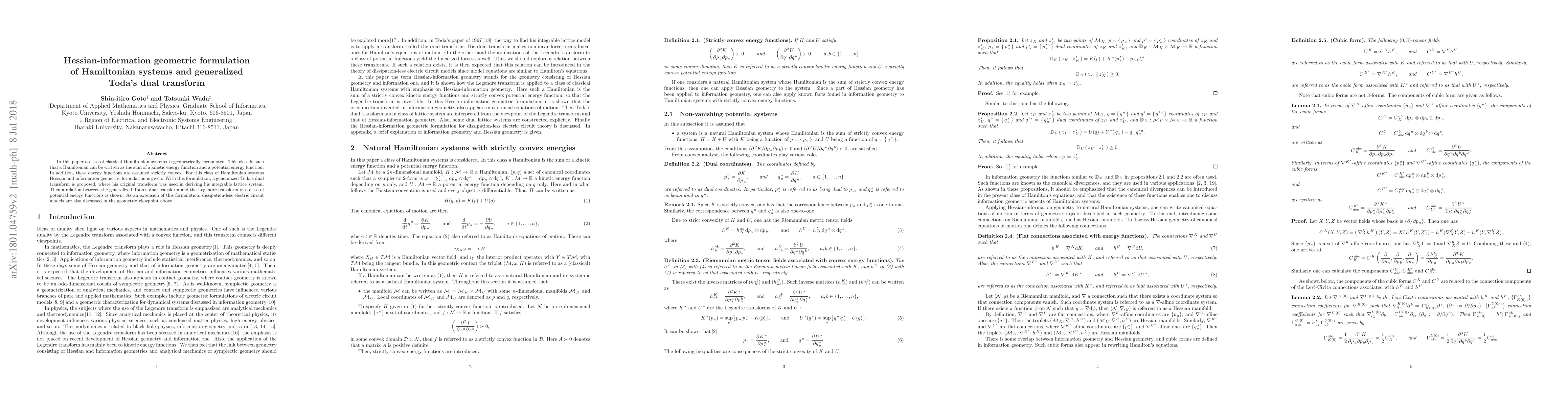 This paper presents a geometric formulation for a class of Hamiltonian systems using Hessian and information geometry, introducing a generalized Toda's dual transform. It also links this transform to Legendre transform of certain potential functions and extends the formulation to dissipation-less electric circuits.