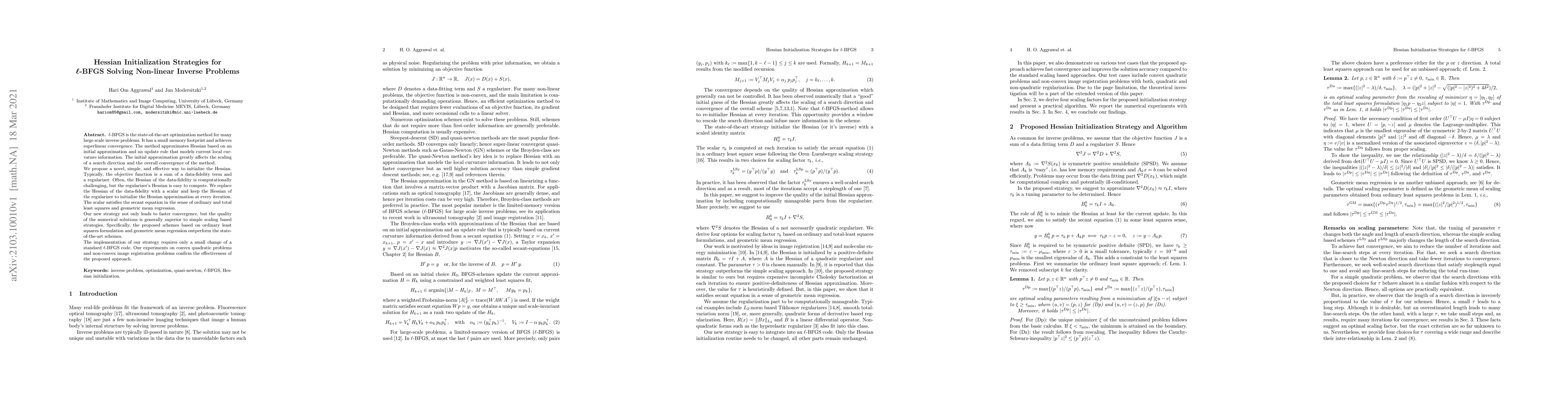 This paper proposes a novel Hessian initialization strategy for L-BFGS optimization, replacing the computationally challenging Hessian of the data-fidelity term with a scalar while retaining the regularizer's Hessian. The new approach results in faster convergence and superior solution quality compared to existing methods, confirmed through experiments on quadratic and image registration problems.
