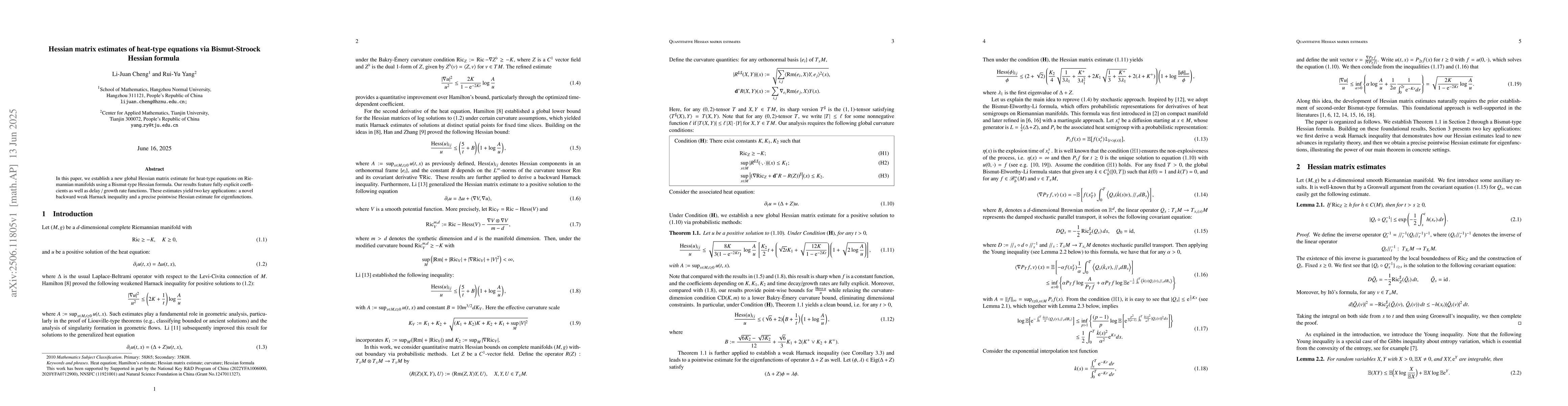In this paper, we establish a new global Hessian matrix estimate for heat-type equations on Riemannian manifolds using a Bismut-type Hessian formula. Our results feature fully explicit coefficients as well as delay / growth rate functions. These estimates yield two key applications: a novel backward weak Harnack inequality and a precise pointwise Hessian estimate for eigenfunctions.