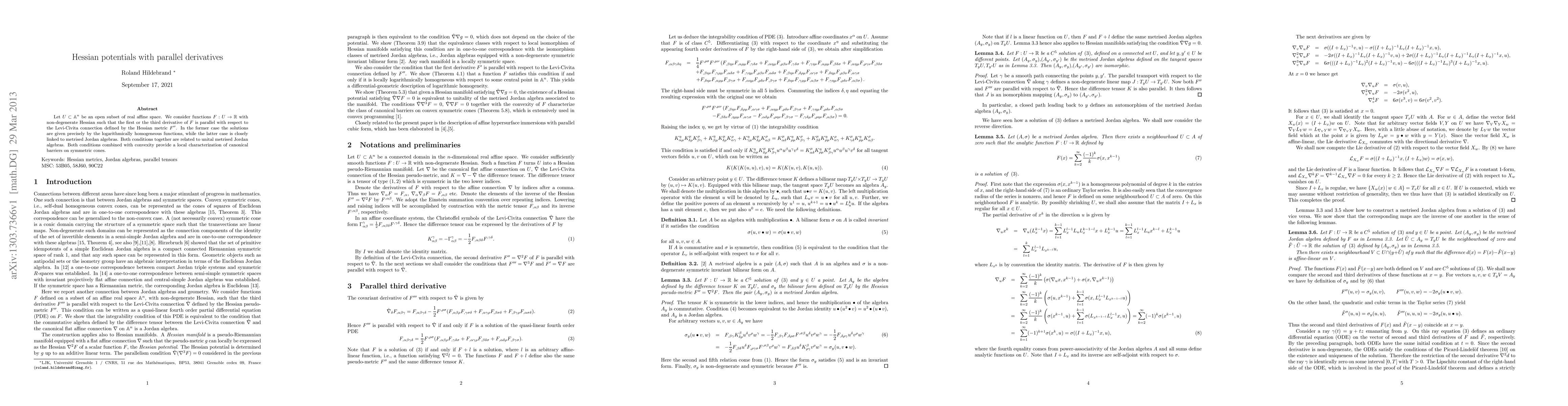 Let $U \subset \mathbb A^n$ be an open subset of real affine space. We consider functions $F: U \to \mathbb R$ with non-degenerate Hessian such that the first or the third derivative of $F$ is parallel with respect to the Levi-Civita connection defined by the Hessian metric $F"$. In the former case the solutions are given precisely by the logarithmically homogeneous functions, while the latter case is closely linked to metrised Jordan algebras. Both conditions together are related to unital metrised Jordan algebras. Both conditions combined with convexity provide a local characterization of canonical barriers on symmetric cones.