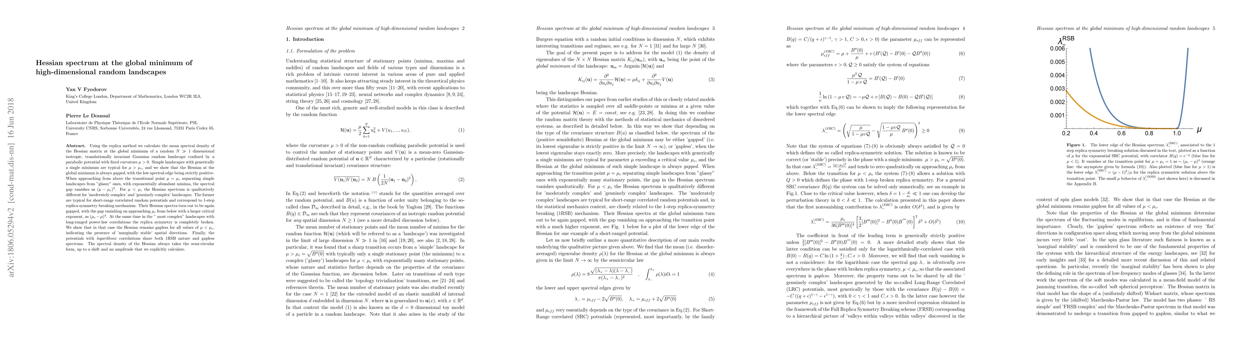 This paper uses the replica method to analyze the Hessian spectrum at the global minimum of high-dimensional Gaussian random landscapes. It finds that the Hessian is gapped with a positive spectral edge, and the gap vanishes as $(\mu-\mu_c)^2$ near the critical point $\mu_c$. For $\mu<\mu_c$, the Hessian spectrum varies depending on the complexity of the landscape, with gapless spectra in the most complex, long-range correlated landscapes.