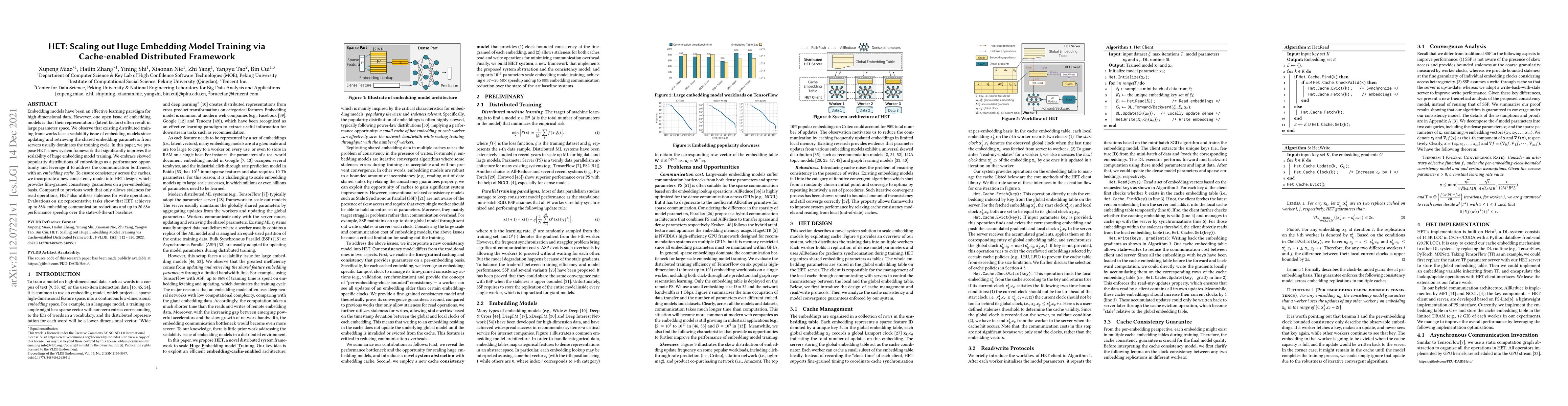 Researchers propose HET, a system framework that improves scalability for huge embedding model training through caching and consistency models, achieving up to 88% communication reduction and 20.68x performance speedup.