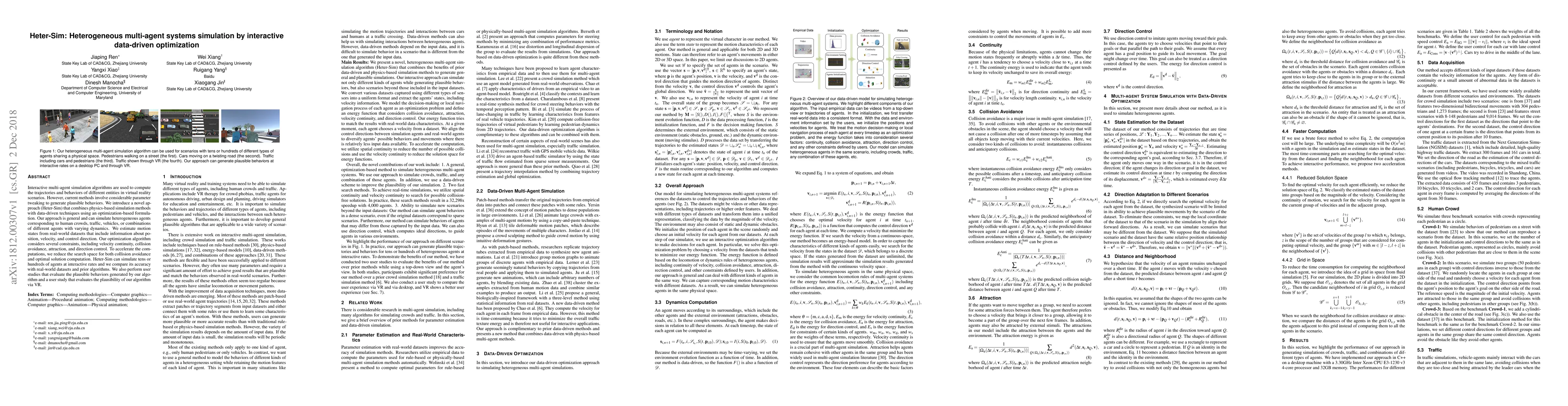 A new approach called Heter-Sim simulates heterogeneous multi-agent systems using physics-based methods and data-driven optimization, allowing for realistic behaviors of various entities in virtual reality scenarios.