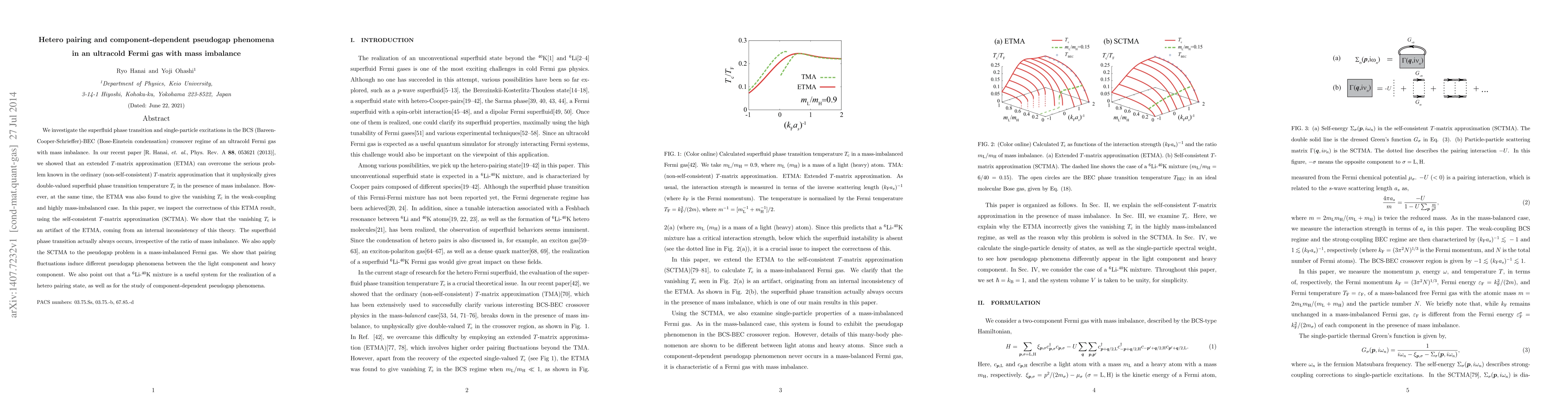 We investigate the superfluid phase transition and single-particle excitations in the BCS (Bareen-Cooper-Schrieffer)-BEC (Bose-Einstein condensation) crossover regime of an ultracold Fermi gas with mass imbalance. In our recent paper [R. Hanai, et. al., Phys. Rev. A 88, 053621 (2013)], we showed that an extended $T$-matrix approximation (ETMA) can overcome the serious problem known in the ordinary (non-self-consistent) $T$-matrix approximation that it unphysically gives double-valued superfluid phase transition temperature $T_{\rm c}$ in the presence of mass imbalance. However, at the same time, the ETMA was also found to give the vanishing $T_{\rm c}$ in the weak-coupling and highly mass-imbalanced case. In this paper, we inspect the correctness of this ETMA result, using the self-consistent $T$-matrix approximation (SCTMA). We show that the vanishing $T_{\rm c}$ is an artifact of the ETMA, coming from an internal inconsistency of this theory. The superfluid phase transition actually always occurs, irrespective of the ratio of mass imbalance. We also apply the SCTMA to the pseudogap problem in a mass-imbalanced Fermi gas. We show that pairing fluctuations induce different pseudogap phenomena between the the light component and heavy component. We also point out that a $^6$Li-$^{40}$K mixture is a useful system for the realization of a hetero pairing state, as well as for the study of component-dependent pseudogap phenomena.