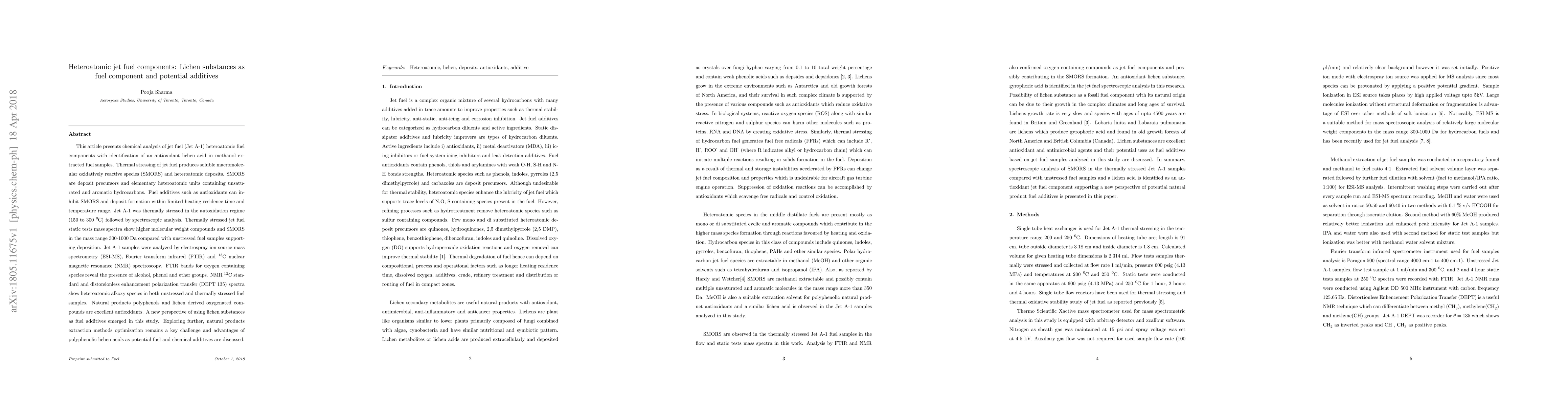 This article presents chemical analysis of jet fuel (Jet A-1) heteroatomic fuel components with identification of an antioxidant lichen substance in methanol extracted fuel samples. Thermal stressing of jet fuel produces soluble macromolecular oxidatively reactive species (SMORS) and heteroatomic deposits. SMORS are deposit precursors and elementary heteroatomic units containing unsaturated and aromatic hydrocarbons. Fuel additives such as antioxidants can inhibit SMORS and deposit formation within limited heating residence time and temperature range. Jet A-1 was thermally stressed in the autoxidation regime (150 to 300 0C) followed by spectroscopic analysis. Thermally stressed jet fuel static tests electrospray ionization mass spectra (ESI-MS) show higher molecular weight compounds in the mass range 300-1000 Da compared with unstressed fuel samples supporting deposition. Jet A-1 samples were analyzed by electrospray ion source mass spectrometry (ESI-MS), Fourier transform infrared (FTIR) and 13C nuclear magnetic resonance (NMR) spectroscopy. FTIR bands for oxygen containing species reveal the presence of alcohol, phenol and ether groups. 13C nuclear magnetic resonance (NMR) standard and distorsionless enhancement polarization transfer (DEPT 135) spectra recorded heteroatomic alkoxy species in both unstressed and thermally stressed fuel samples. Natural products polyphenols and lichen derived oxygenated compounds are excellent antioxidants. A new perspective of using lichen substances as fuel additives emerged in this study. Exploring further, natural products extraction methods optimization remains a key challenge and advantages of polyphenolic lichen acids as potential fuel and chemical additives are discussed.