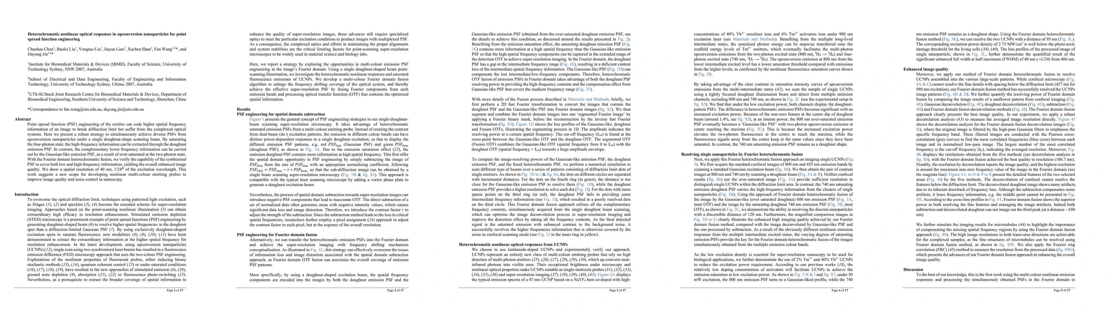 Point spread function (PSF) engineering of the emitter can code higher spatial frequency information of an image to break diffraction limit but suffer from the complexed optical systems. Here we present a robust strategy to simultaneously achieve diverse PSFs from upconversion nanoparticles under a single doughnut-shape scanning beam. By saturating the four-photon state, the high-frequency information can be extracted through the doughnut emission PSF. In contrast, the complementary lower frequency information can be carried out by the Gaussian-like emission PSF, as a result of over-saturated at the two-photon state. With the Fourier domain heterochromatic fusion, we verify the capability of the synthesised PSF to cover both low and high-frequency information, yielding the overall enhanced image quality. We show a spatial resolution of 40 nm, 1/24th of the excitation wavelength. This work suggests a new scope for developing nonlinear multi-colour emitting probes to improve image quality and noise control in nanoscopy.