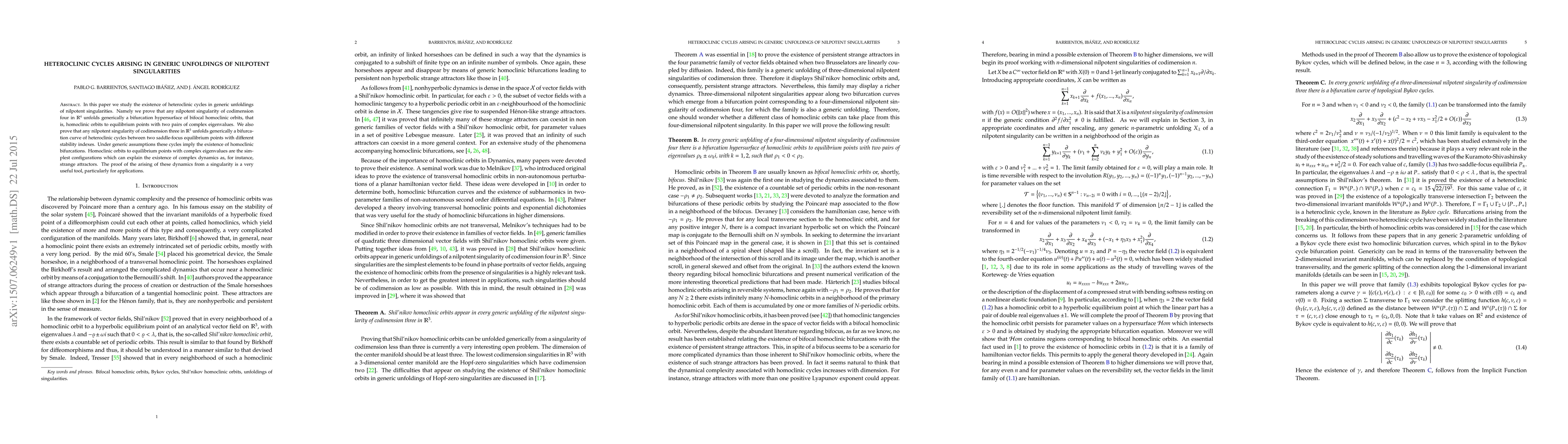 In this paper we study the existence of heteroclinic cycles in generic unfoldings of nilpotent singularities. Namely we prove that any nilpotent singularity of codimension four in $\mathbb{R}^4$ unfolds generically a bifurcation hypersurface of bifocal homoclinic orbits, that is, homoclinic orbits to equilibrium points with two pairs of complex eigenvalues. We also prove that any nilpotent singularity of codimension three in $\mathbb{R}^3$ unfolds generically a bifurcation curve of heteroclinic cycles between two saddle-focus equilibrium points with different stability indexes. Under generic assumptions these cycles imply the existence of homoclinic bifurcations. Homoclinic orbits to equilibrium points with complex eigenvalues are the simplest configurations which can explain the existence of complex dynamics as, for instance, strange attractors. The proof of the arising of these dynamics from a singularity is a very useful tool, particularly for applications.